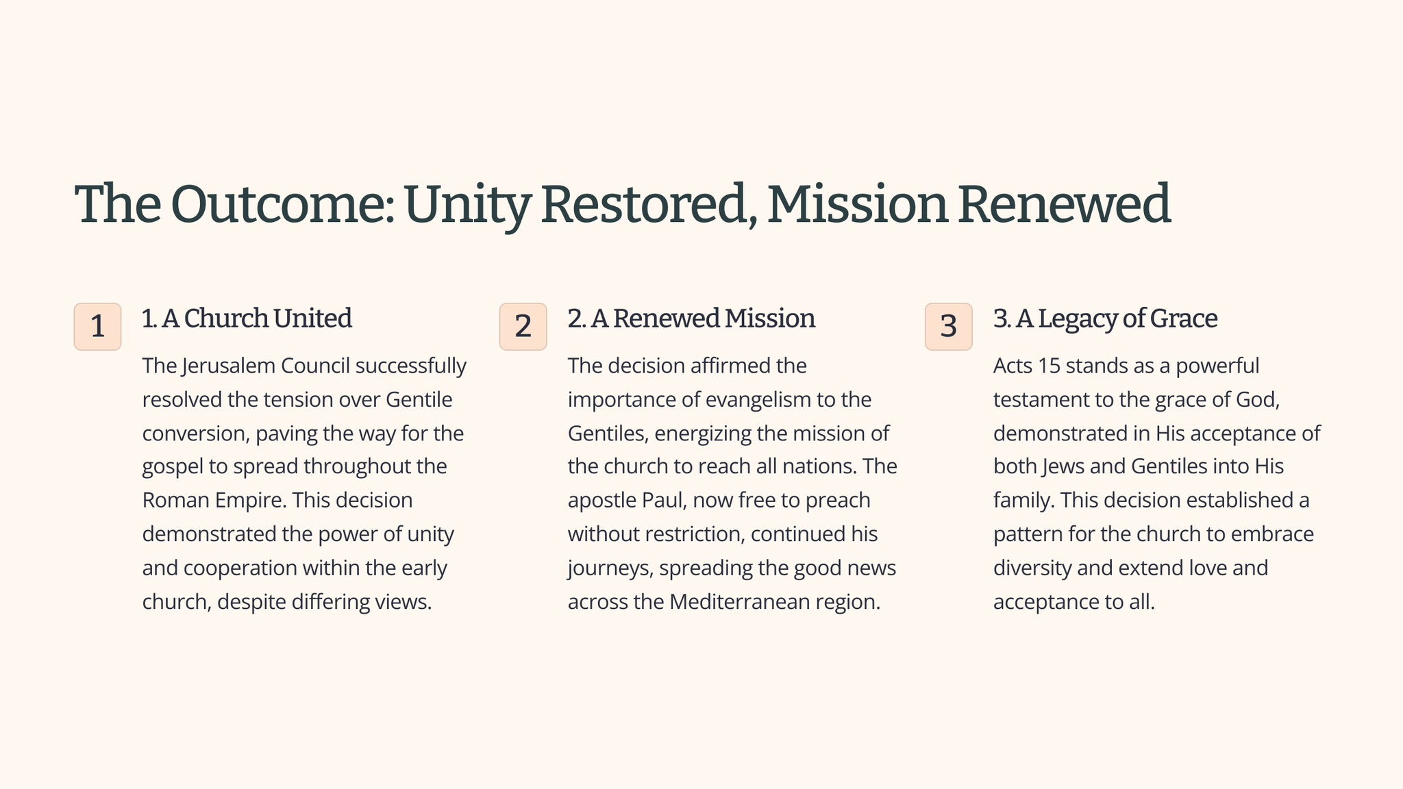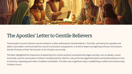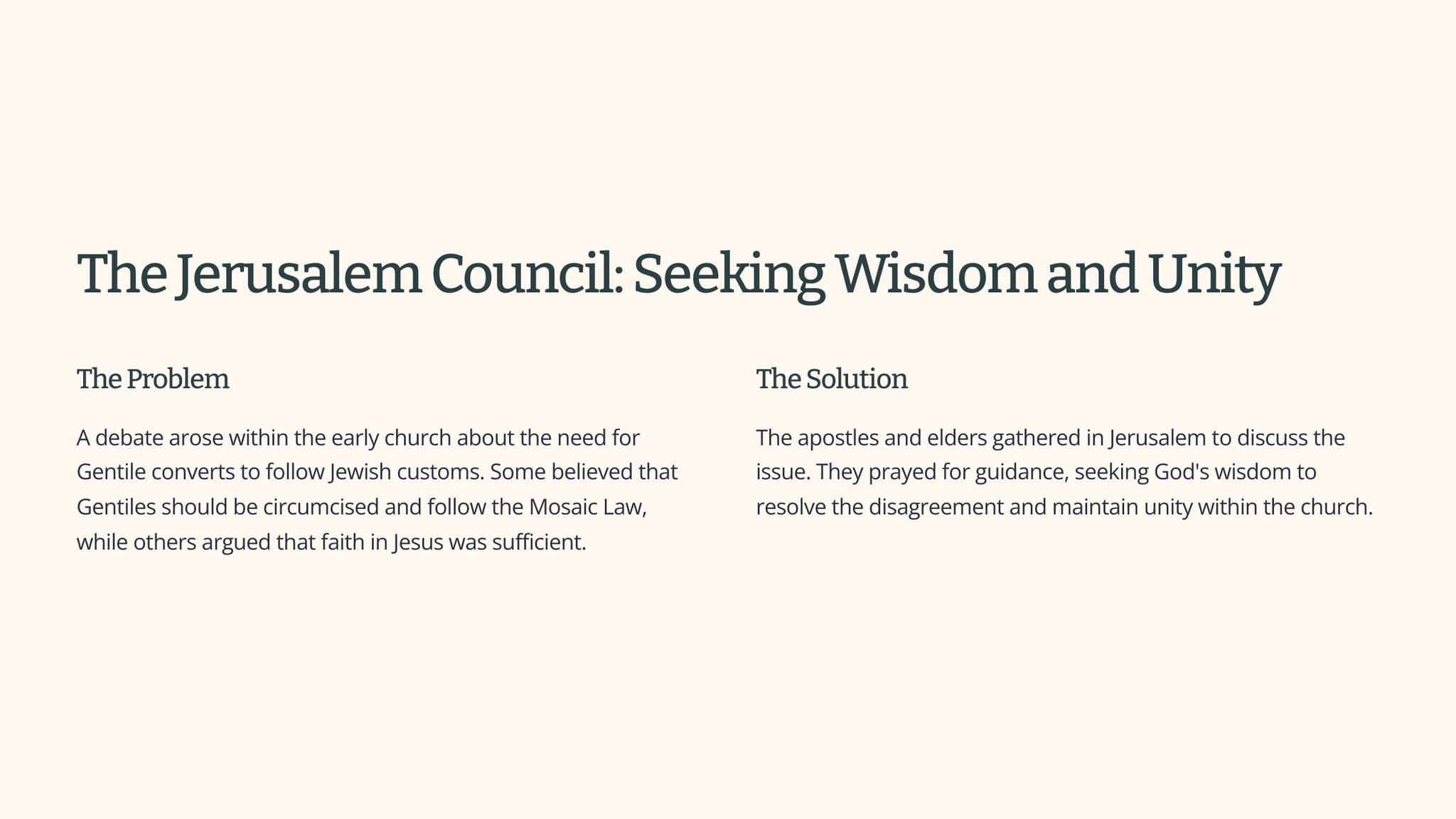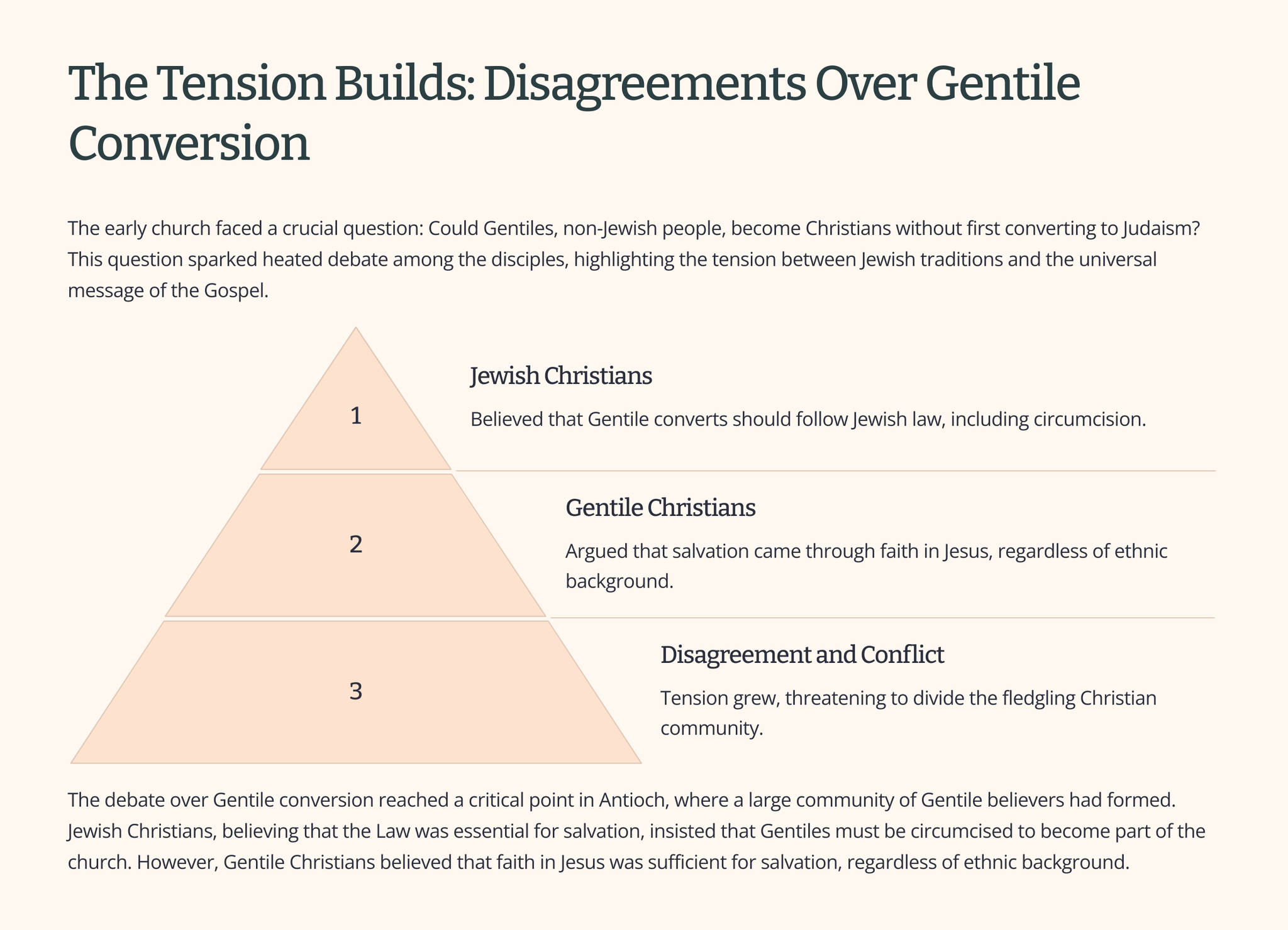 Die boek Handelinge vertel die groei van die vroeë Christelike kerk. In hoofstuk 15 ontmoet ons 'n deurslaggewende oomblik wat die toekoms van die Christendom direk vorm. Die apostels en ouderlinge kom in Jerusalem bymekaar om die groeiende spanning tussen Joodse en nie-Joodse gelowiges aan te spreek. Die kwessie ter sprake is of heidene Joodse wette, spesifiek die besnydenis, moet volg om Christene te word. Die uitkoms van hierdie vergadering sal beduidende implikasies hê vir die verspreiding van die Christendom deur die hele Romeinse wêreld.