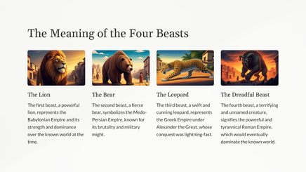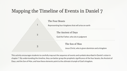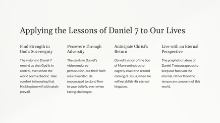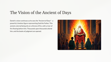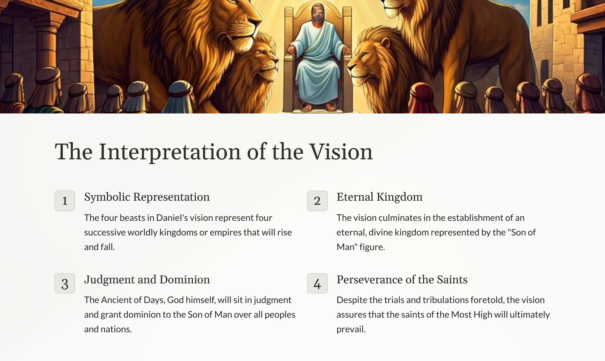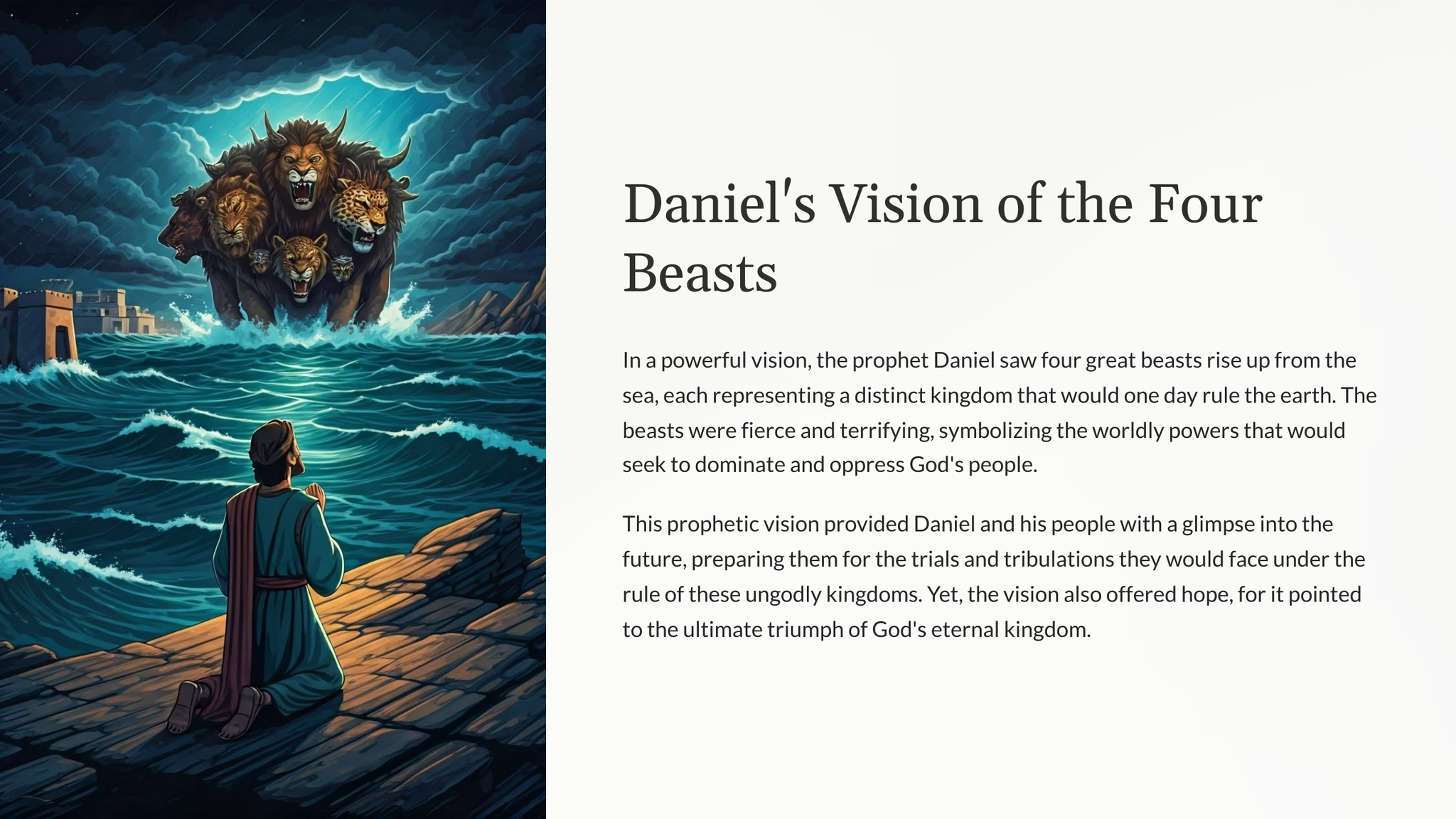 In hierdie hoofstuk uit die Boek Daniël ontvang die profeet 'n reeks apokaliptiese visioene wat die opkoms en val van magtige koninkryke en die uiteindelike vestiging van God se ewige koninkryk voorspel.