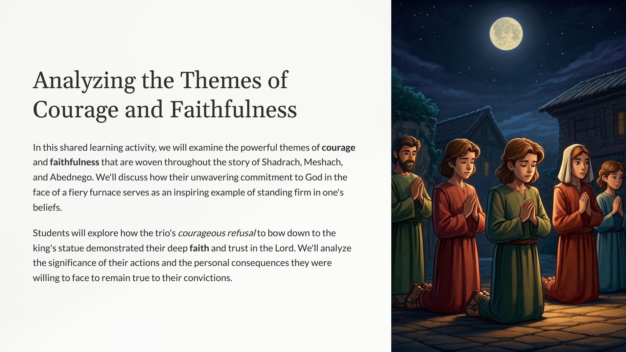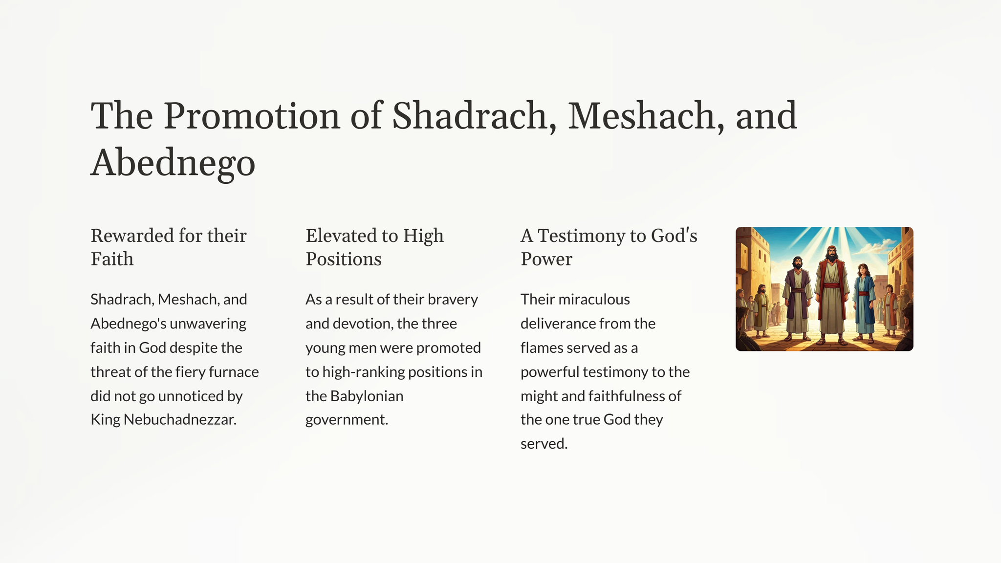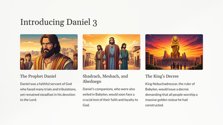 Ontdek die kragtige verhaal van Sadrag, Mesag en Abednego, wat vasgestaan het in hul geloof ten spyte van die bedreiging van 'n vuuroond. Hierdie deurslaggewende oomblik in die boek Daniël openbaar die onwrikbare moed en vertroue in God wat ons almal kan inspireer.