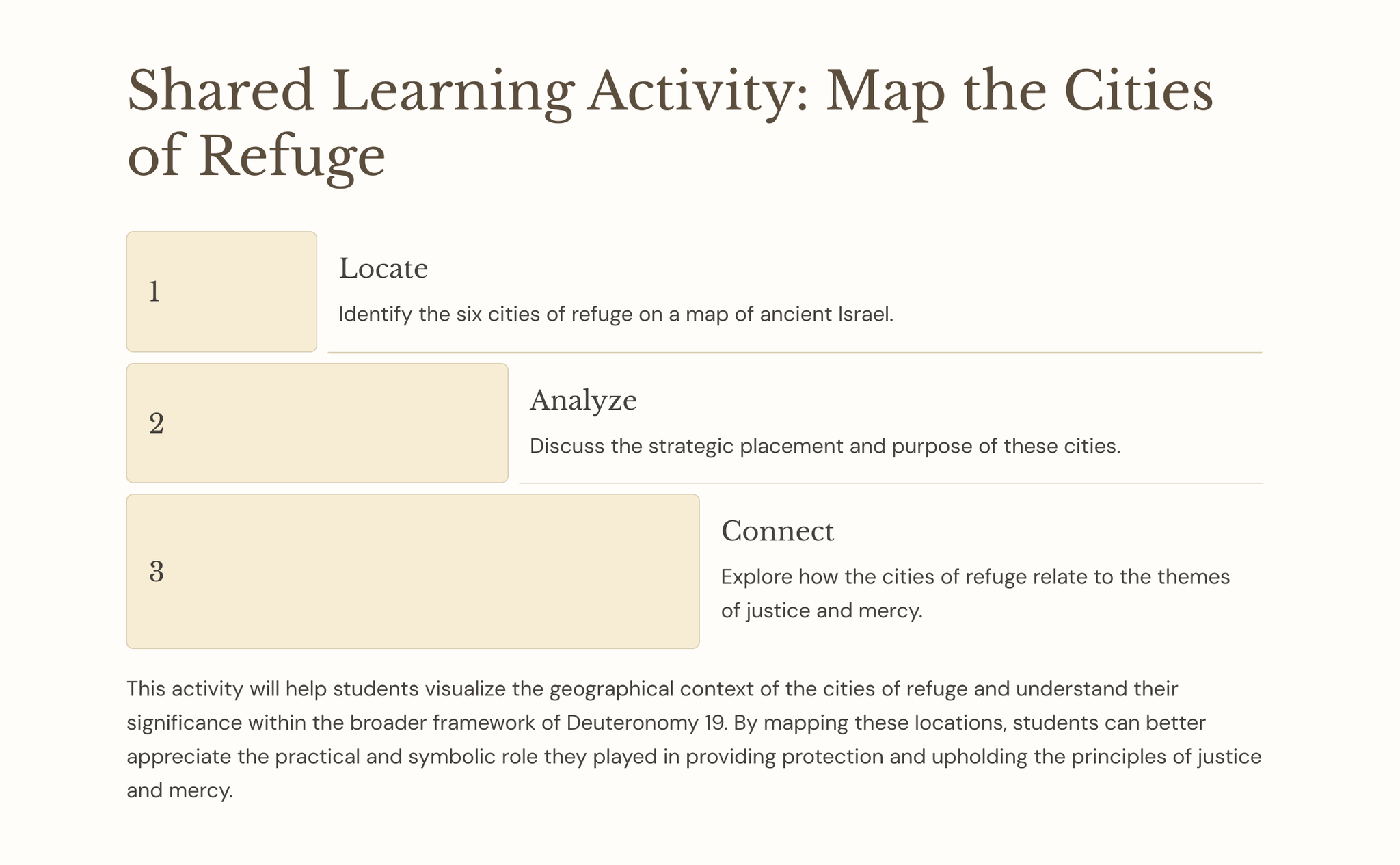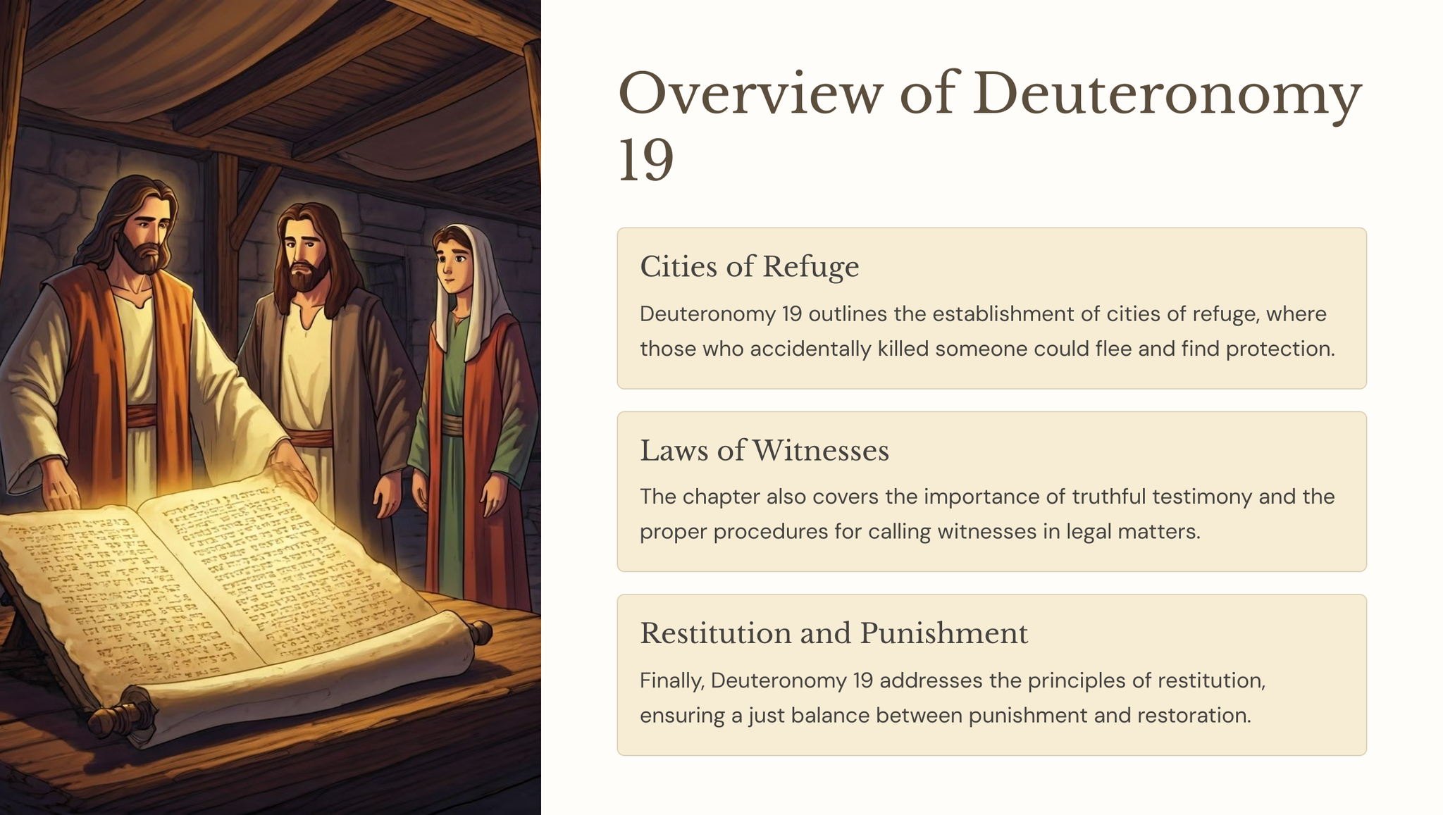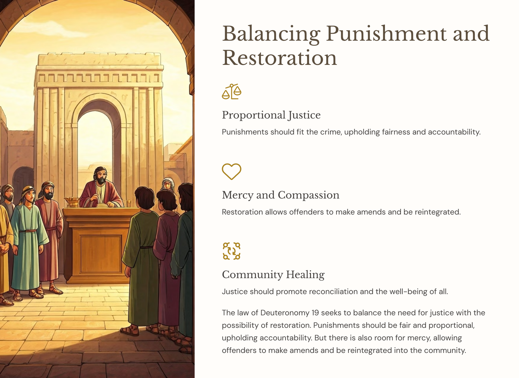 In hierdie hoofstuk verskaf Moses leiding oor die stigting van toevlugstede en die hantering van regsaangeleenthede met regverdigheid en deernis. Die beginsels van geregtigheid en barmhartigheid is sentraal tot die handhawing van 'n regverdige samelewing.