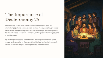 Deuteronomium 25 skets etiese riglyne en wette wat bedoel was om 'n regverdige en regverdige samelewing in antieke Israel te bevorder. Hierdie beginsels het kwessies van geregtigheid, deernis en gemeenskapsverantwoordelikheid aangespreek.
