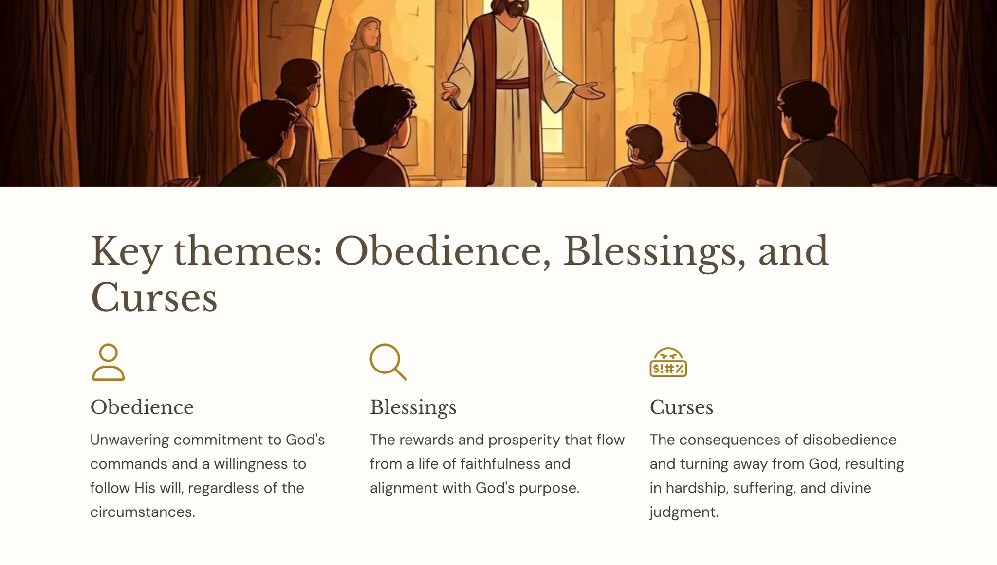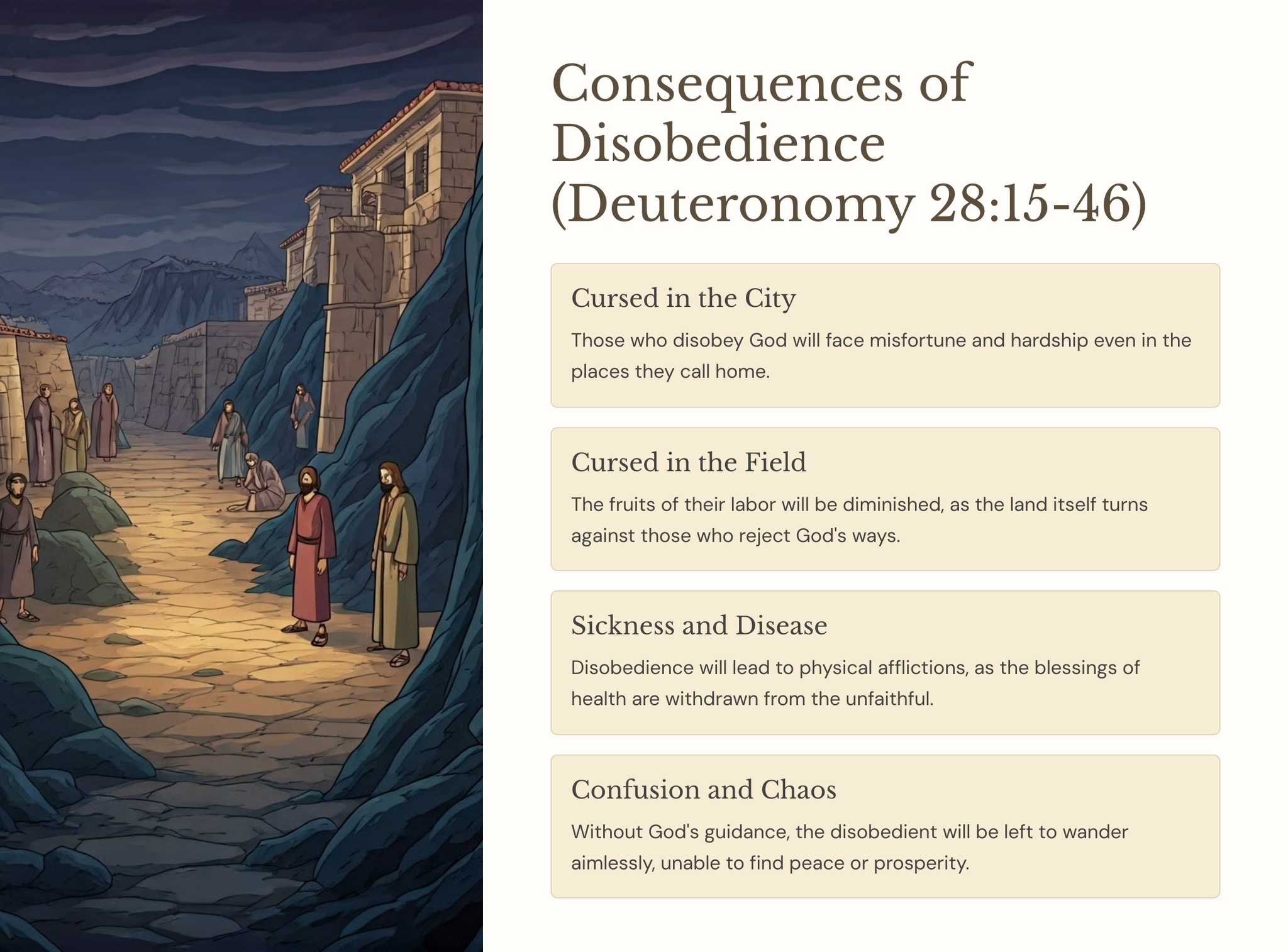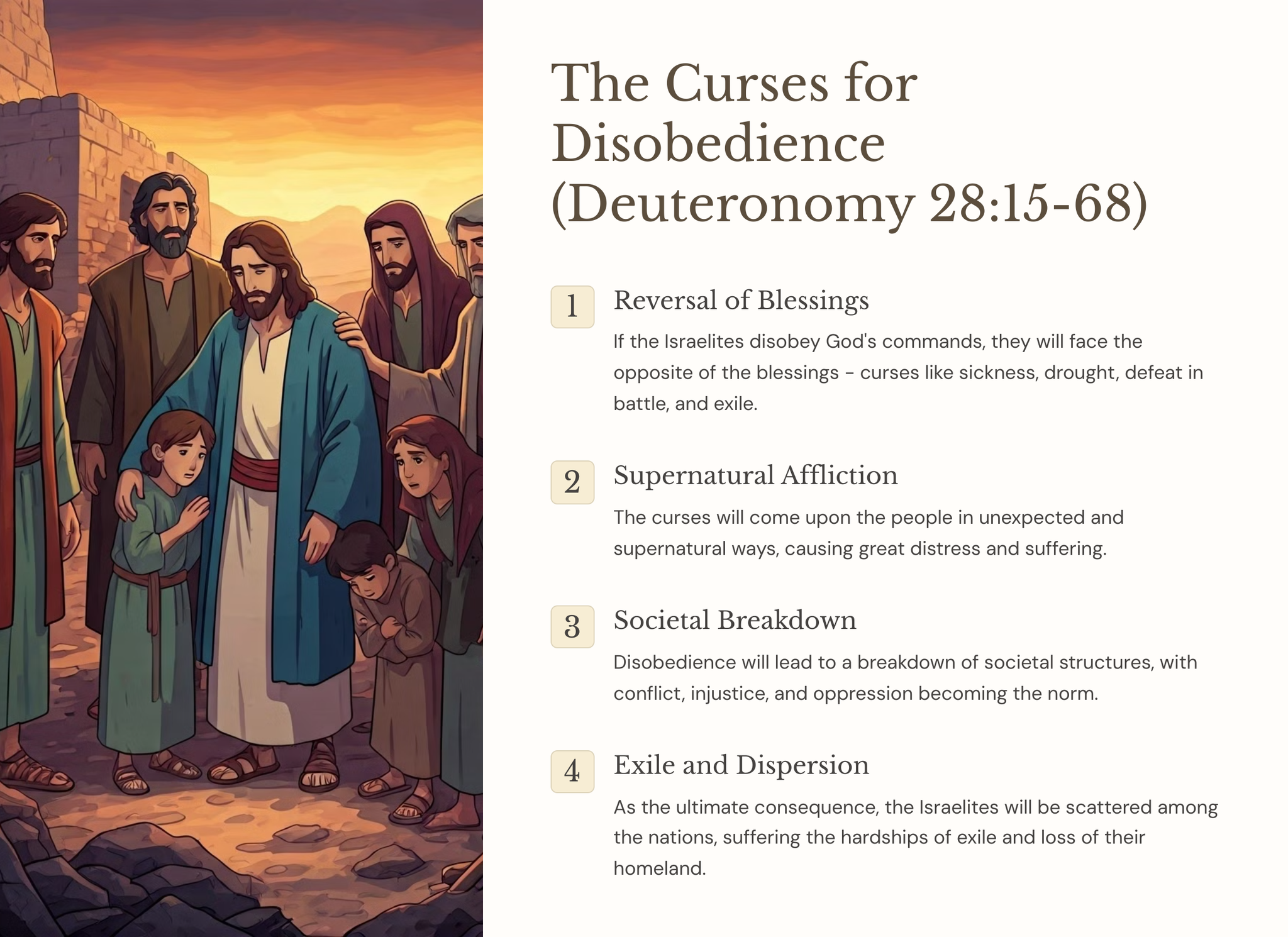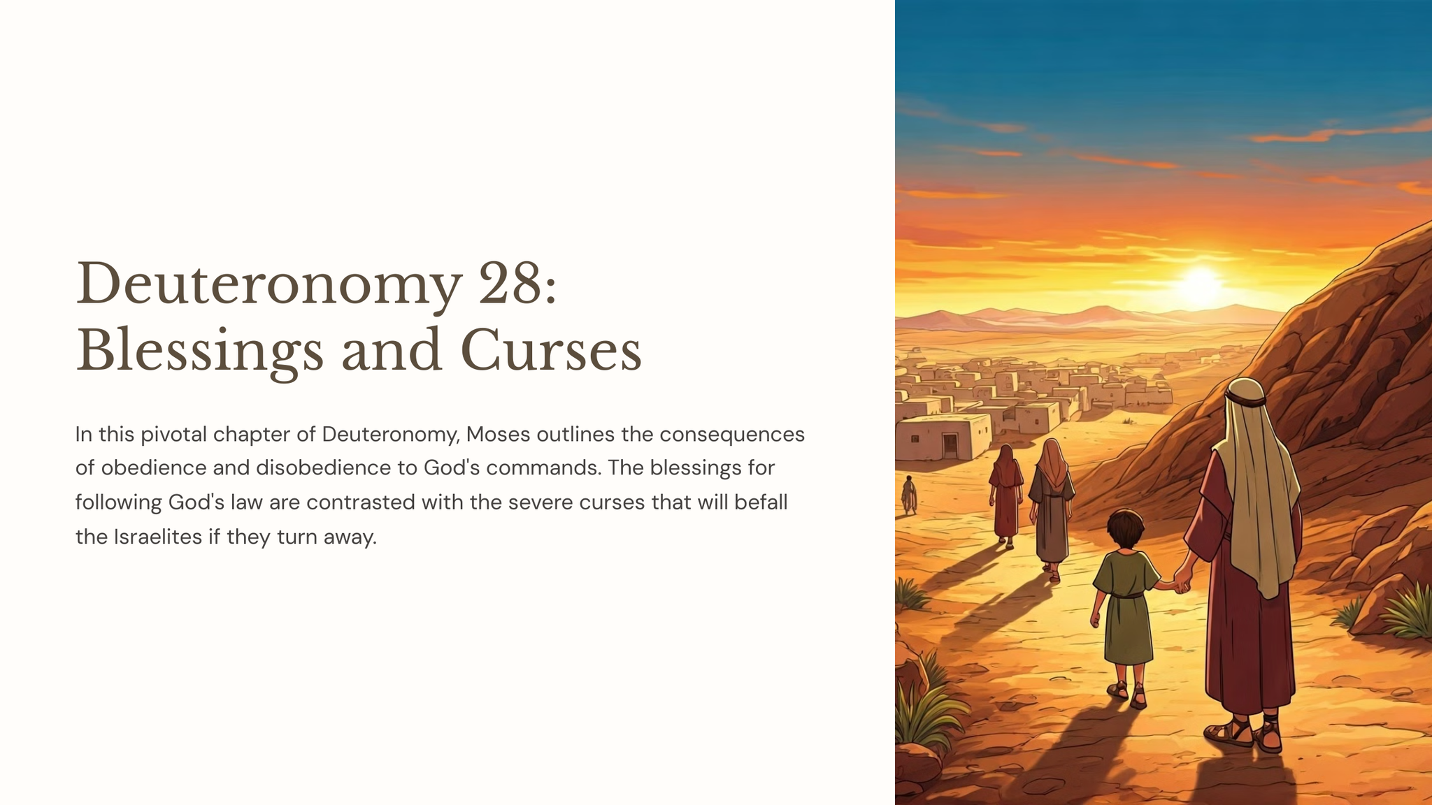 In hierdie deurslaggewende hoofstuk van Deuteronomium skets Moses die gevolge van gehoorsaamheid en ongehoorsaamheid aan God se opdragte. Die seëninge vir die nakoming van God se wet word gekontrasteer met die erge vloeke wat die Israeliete sal tref as hulle wegdraai.