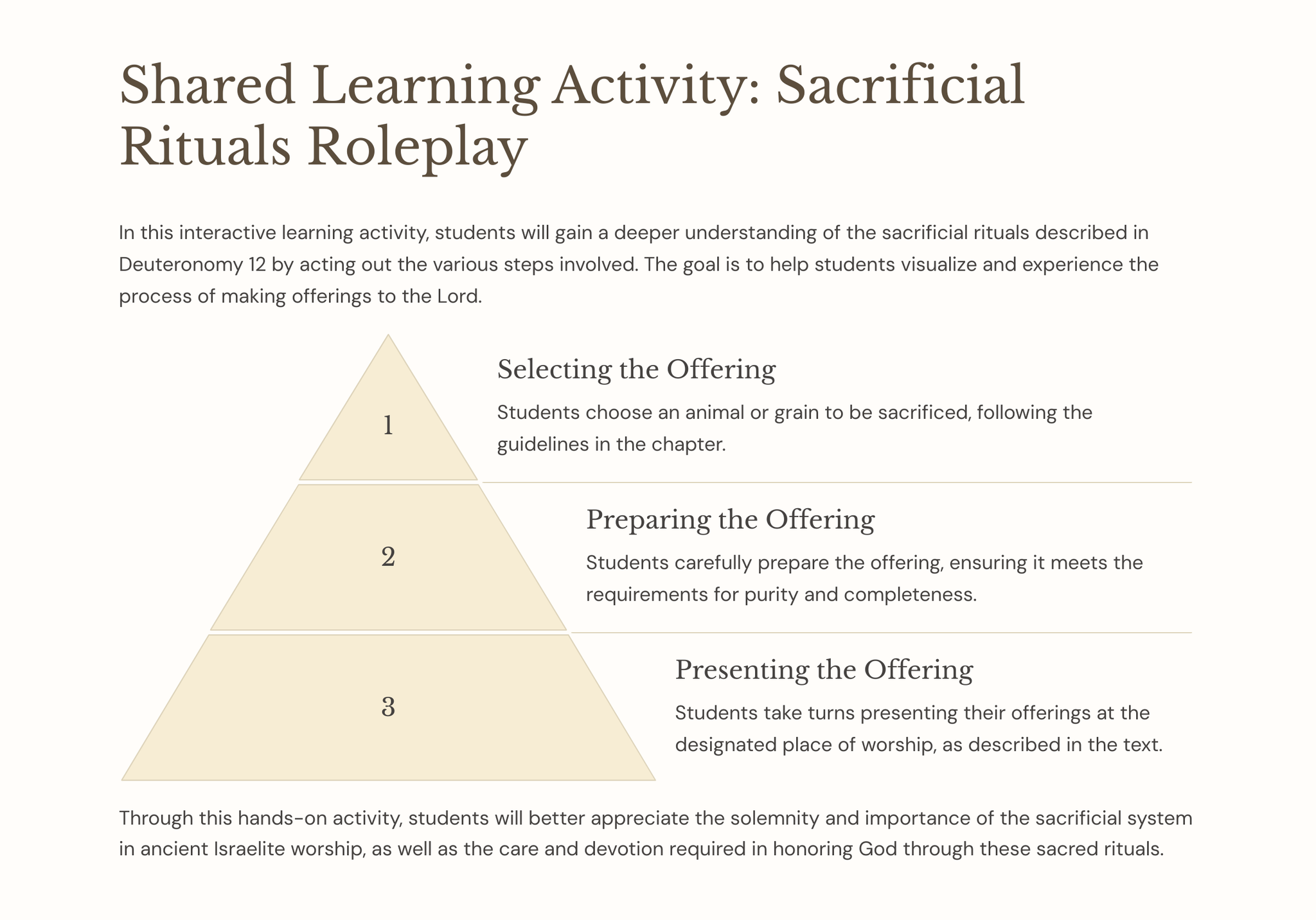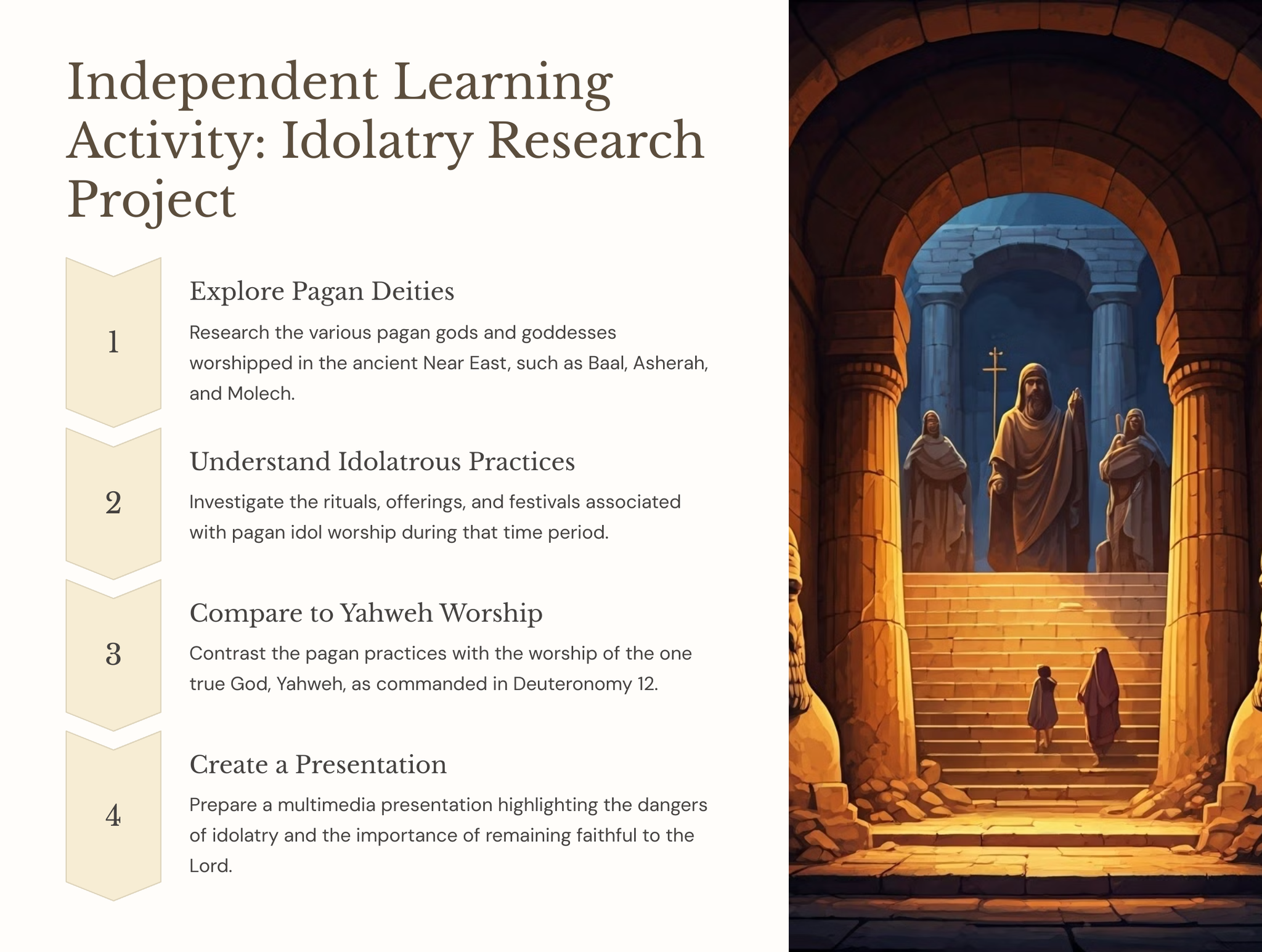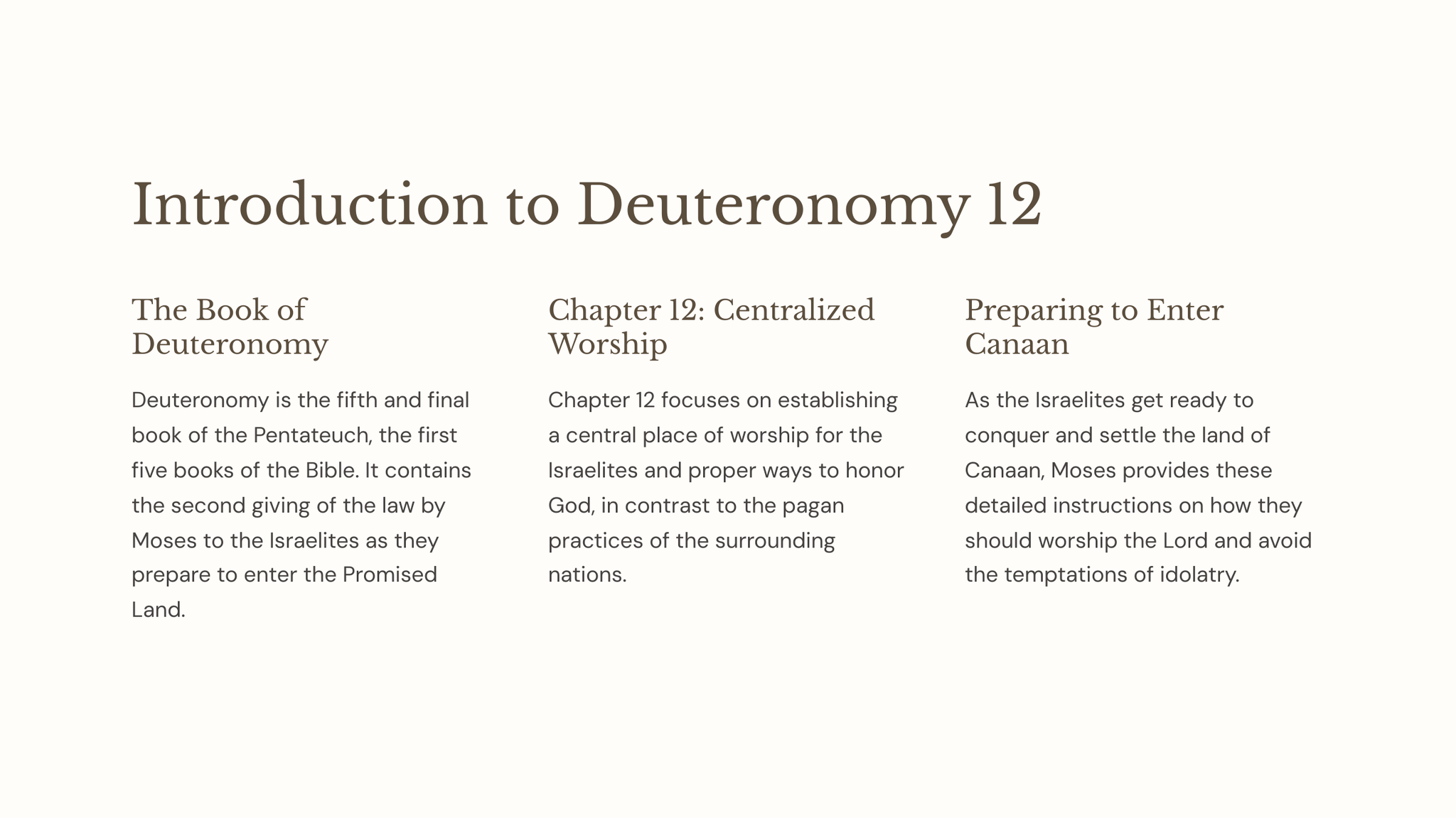 In hierdie hoofstuk lê Moses God se instruksies vir die Israeliete uit oor hoe om Hom in die Beloofde Land te aanbid en te dien. Sleuteltemas sluit in gesentraliseerde aanbidding, die vernietiging van heidense heiligdomme en die aanbieding van behoorlike offers.