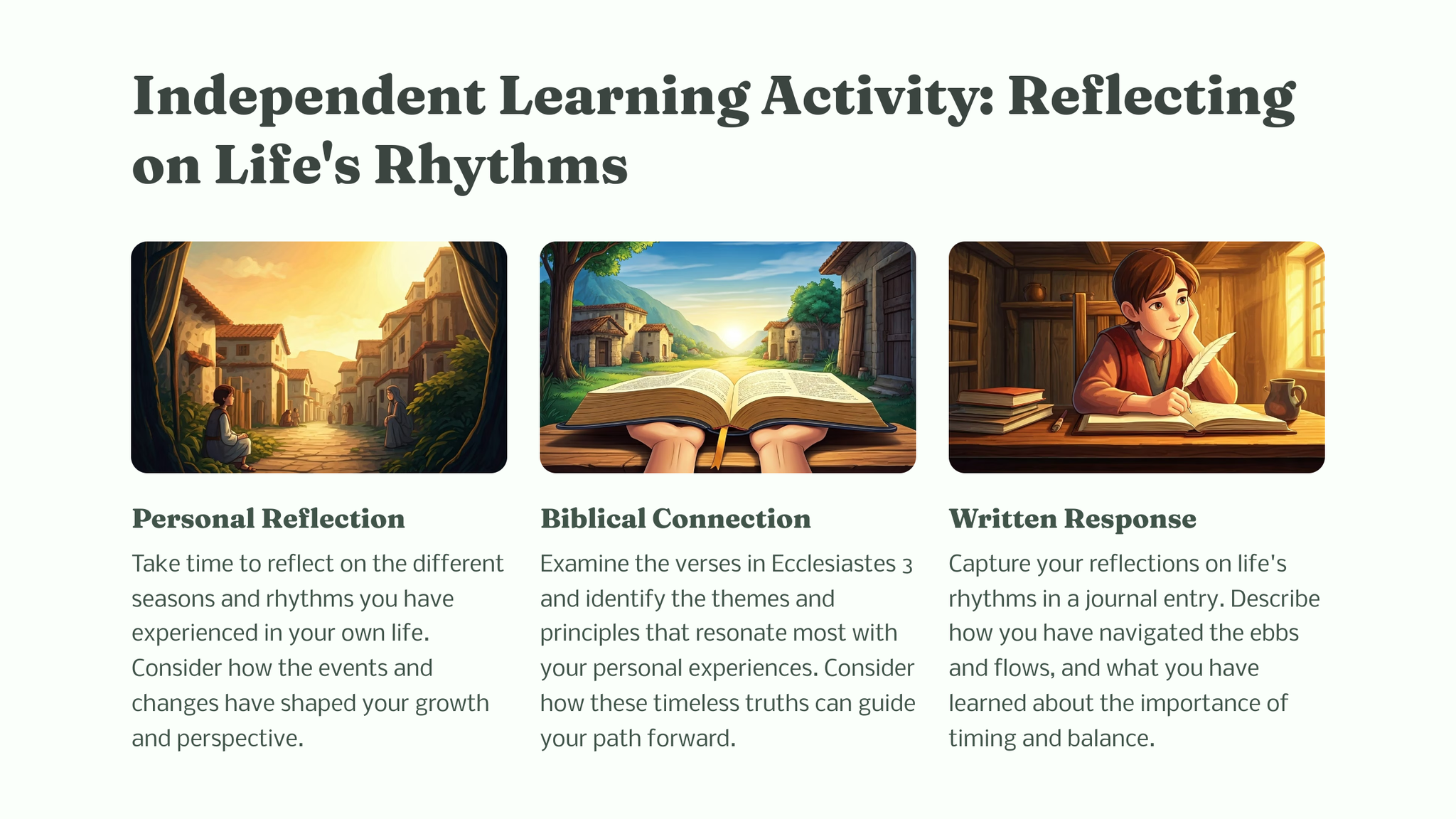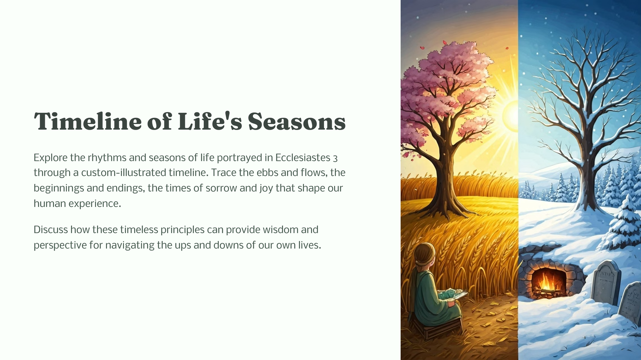 Prediker 3 ondersoek die ritme en doel van die lewe, en herinner ons daaraan dat daar 'n seisoen en gepaste tyd is vir elke aktiwiteit onder die hemel. Hierdie tydlose gedeelte moedig ons aan om die uiteenlopende ervarings wat ons lewens vorm, te omhels.