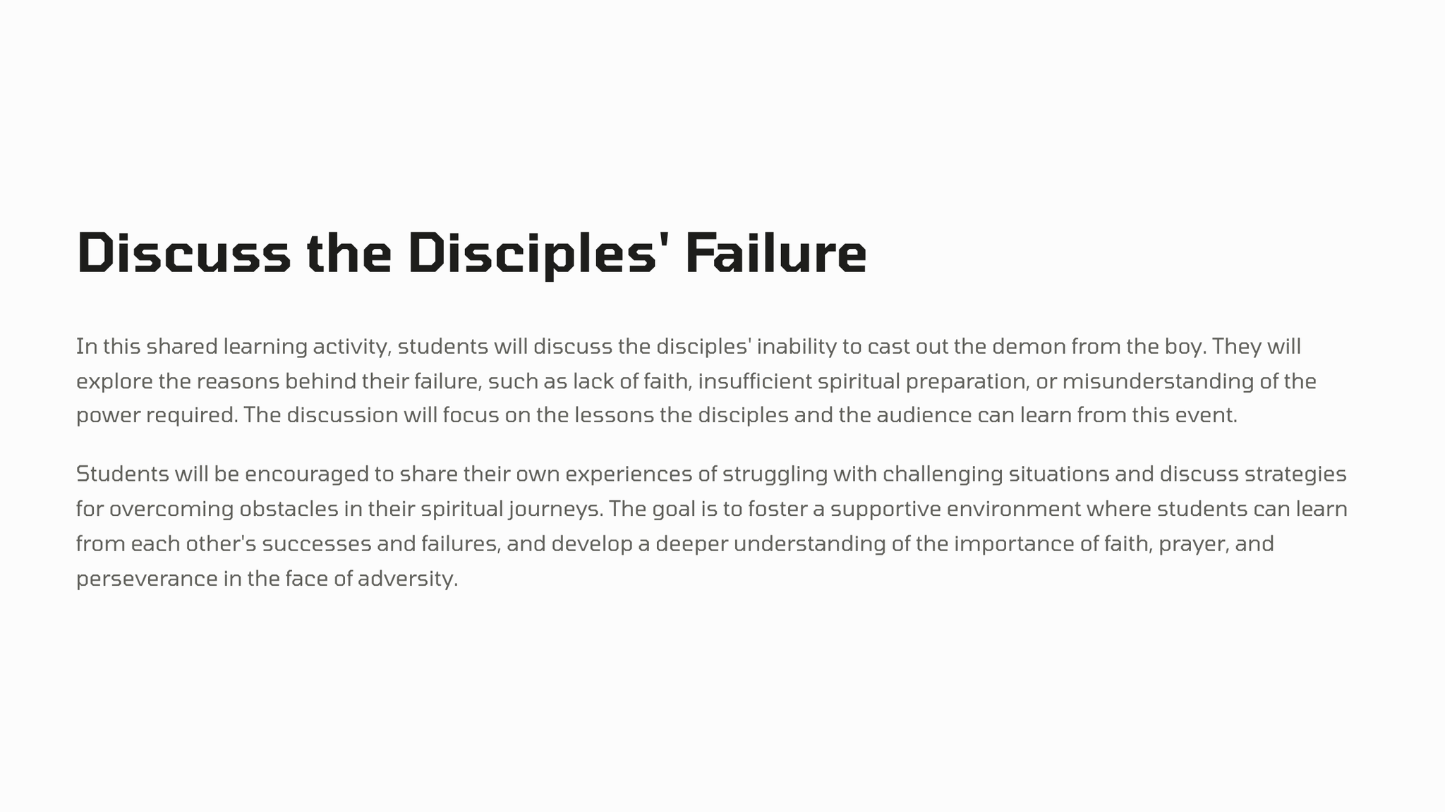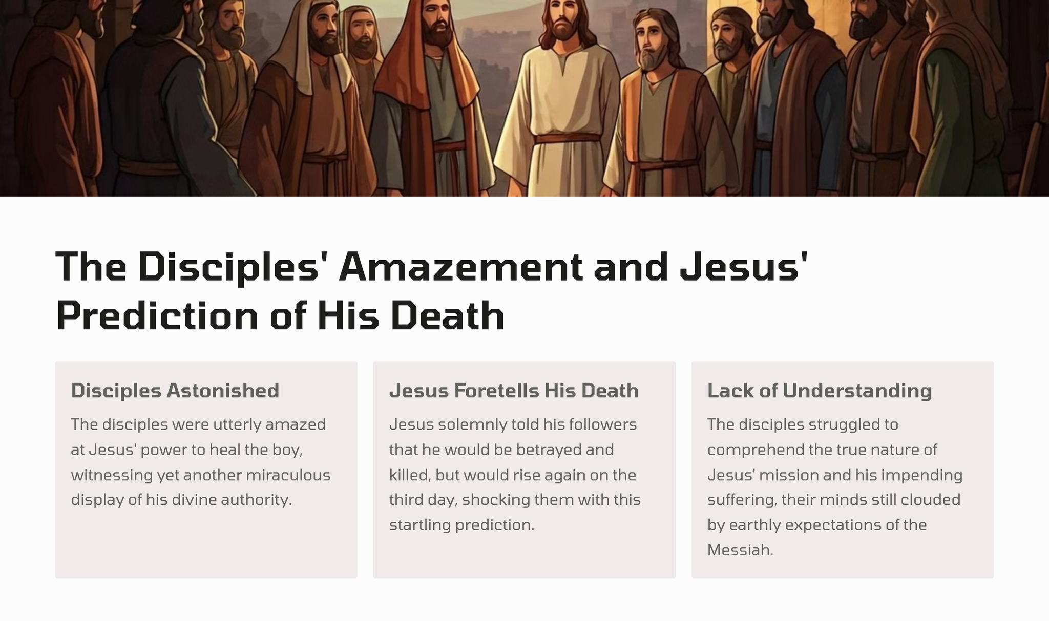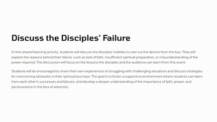 Jesus en sy dissipels ontmoet 'n jong seun wat deur 'n onrein gees beset is, wat die krag van geloof en die gesag wat aan diegene wat Christus volg, ten toon stel.