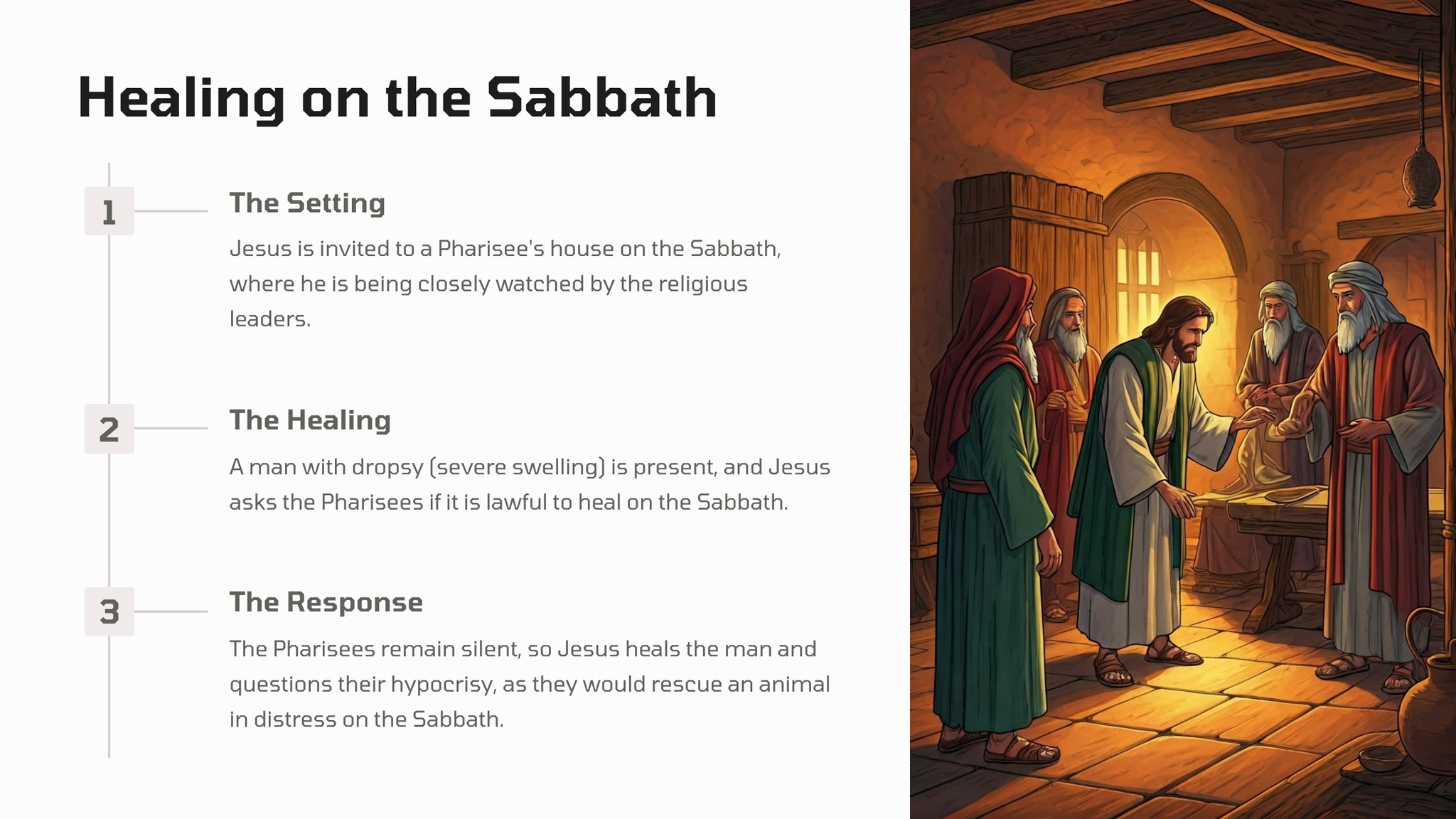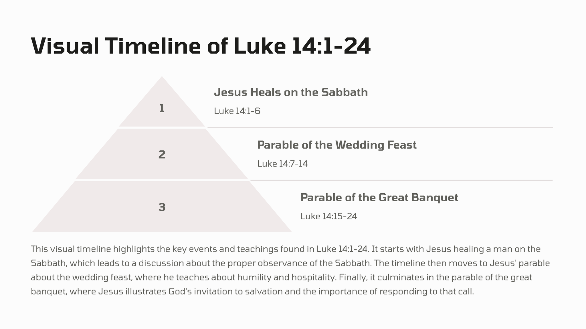 In hierdie gedeelte uit die Evangelie van Lukas deel Jesus diepgaande insigte tydens 'n Sabbatmaaltyd, daag hy die sosiale norme uit en nooi almal uit om 'n lewe van nederigheid, deernis en radikale gasvryheid te omhels.