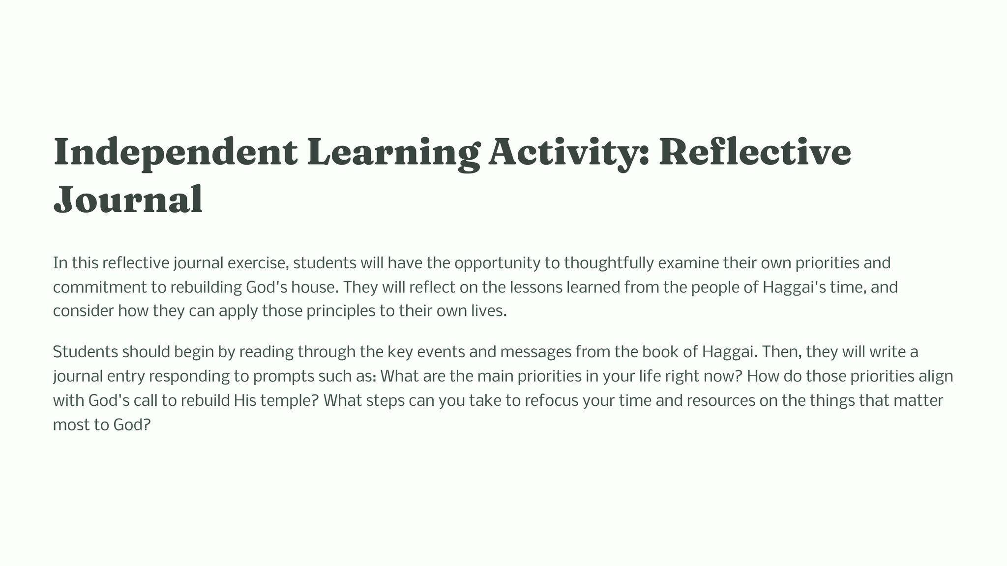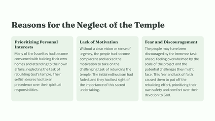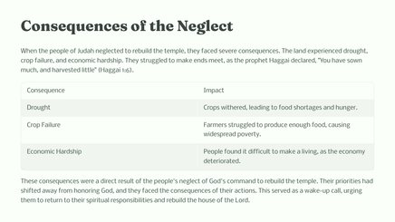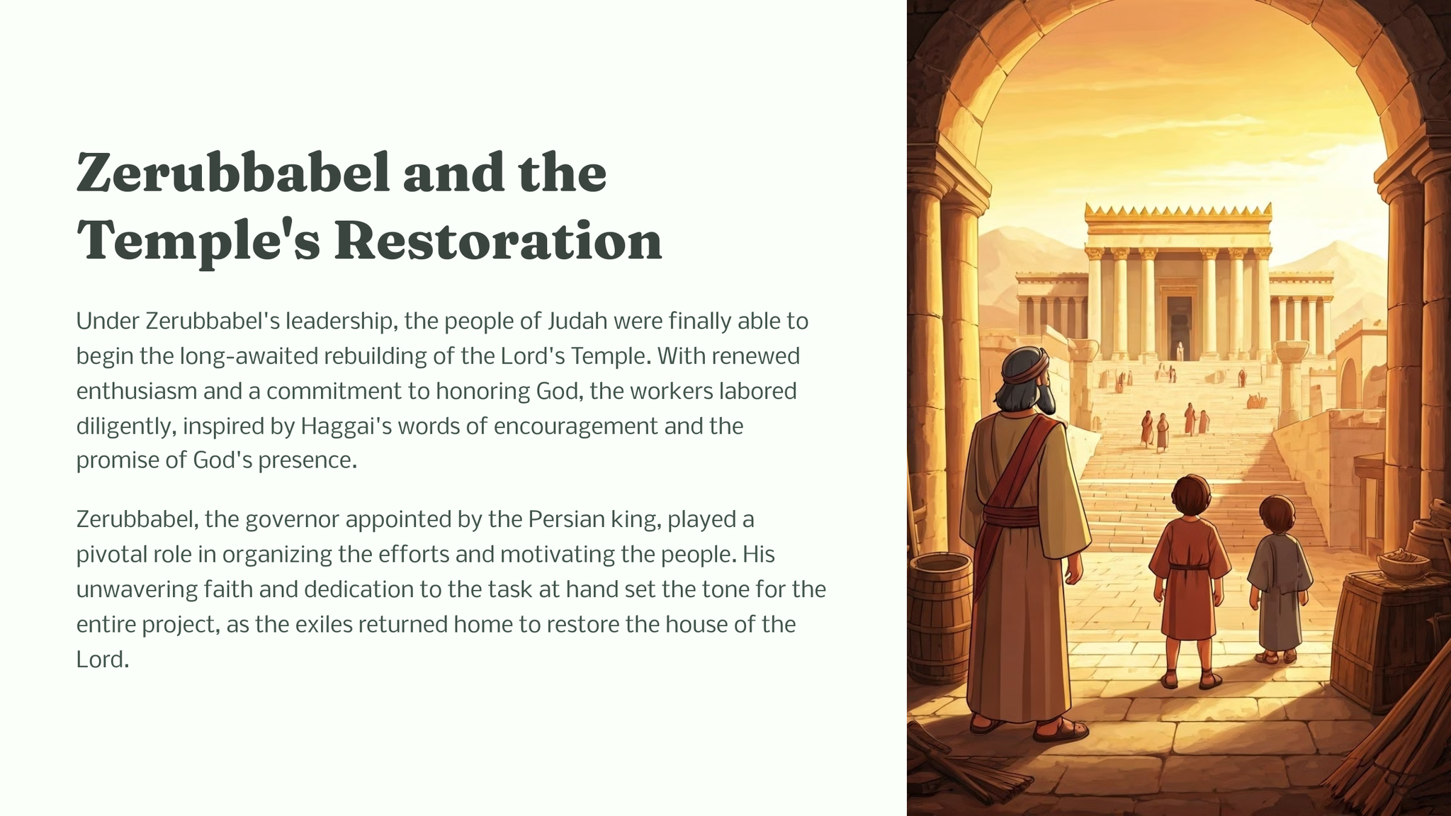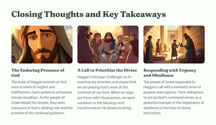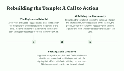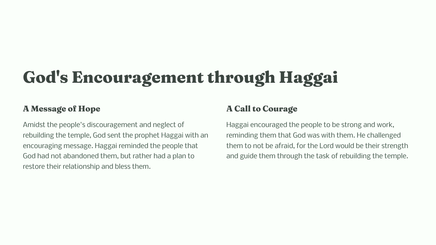 In die boek Haggai lewer die profeet 'n kragtige boodskap van God aan die Israeliete, wat hulle aanspoor om die tempel in Jerusalem te herbou. Dit was 'n kritieke tyd aangesien die mense uit ballingskap teruggekeer het en gefokus was op die herbou van hul huise en lewens, maar die Here se huis verwaarloos het.