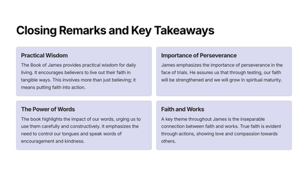 Jakobus herinner ons daaraan dat ware geloof nie bloot intellektuele instemming is nie, maar 'n lewende en aktiewe krag wat ons lewens verander. Hy beklemtoon die belangrikheid van liefde, geduld, nederigheid en volharding as noodsaaklike komponente van 'n opregte geloof.