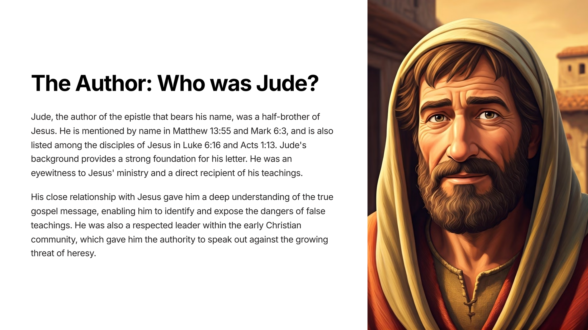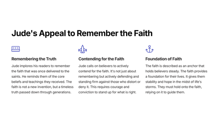 Judas, die halfbroer van Jesus, herinner ons daaraan dat ons selfs in die aangesig van teëspoed geanker moet bly in die waarheid en veg vir die geloof wat eens vir altyd aan die heiliges oorgelewer is. Hierdie brief dien as 'n tydlose herinnering aan die ewige waarhede wat ons lei op ons reis van geloof.