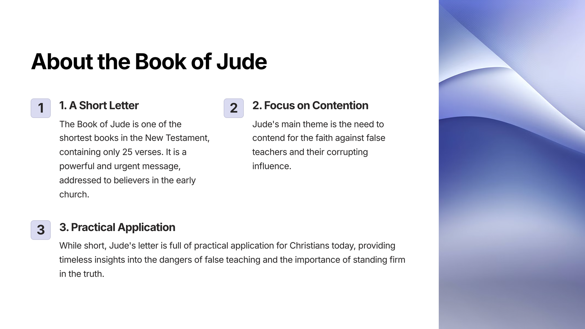 Die brief van Judas is 'n kragtige en bondige brief wat direk praat oor die uitdagings wat gelowiges in die eerste eeu in die gesig gestaar het. Dit waarsku teen dwaalleraars en beklemtoon die belangrikheid van gesonde leerstellings en standvastige geloof.