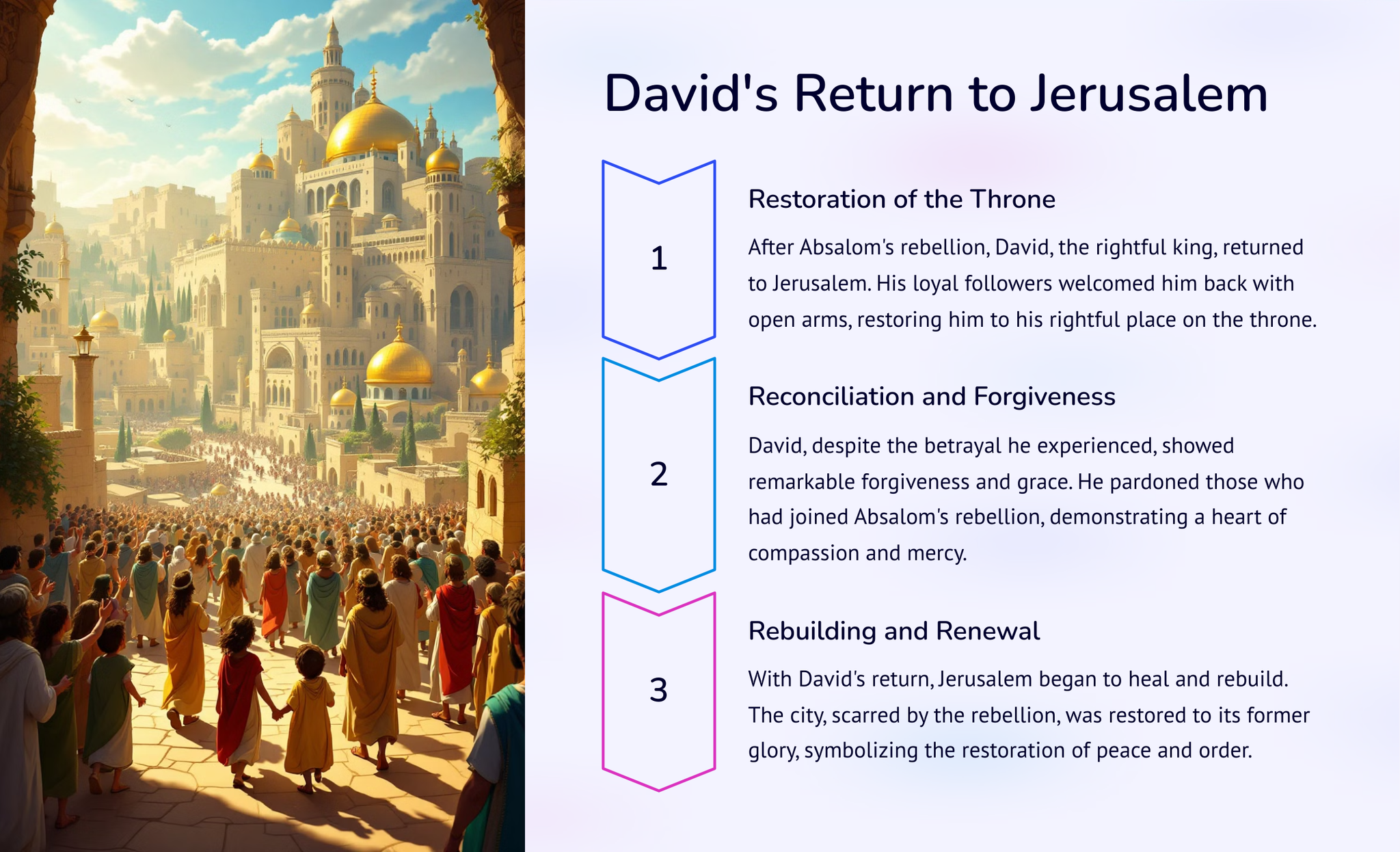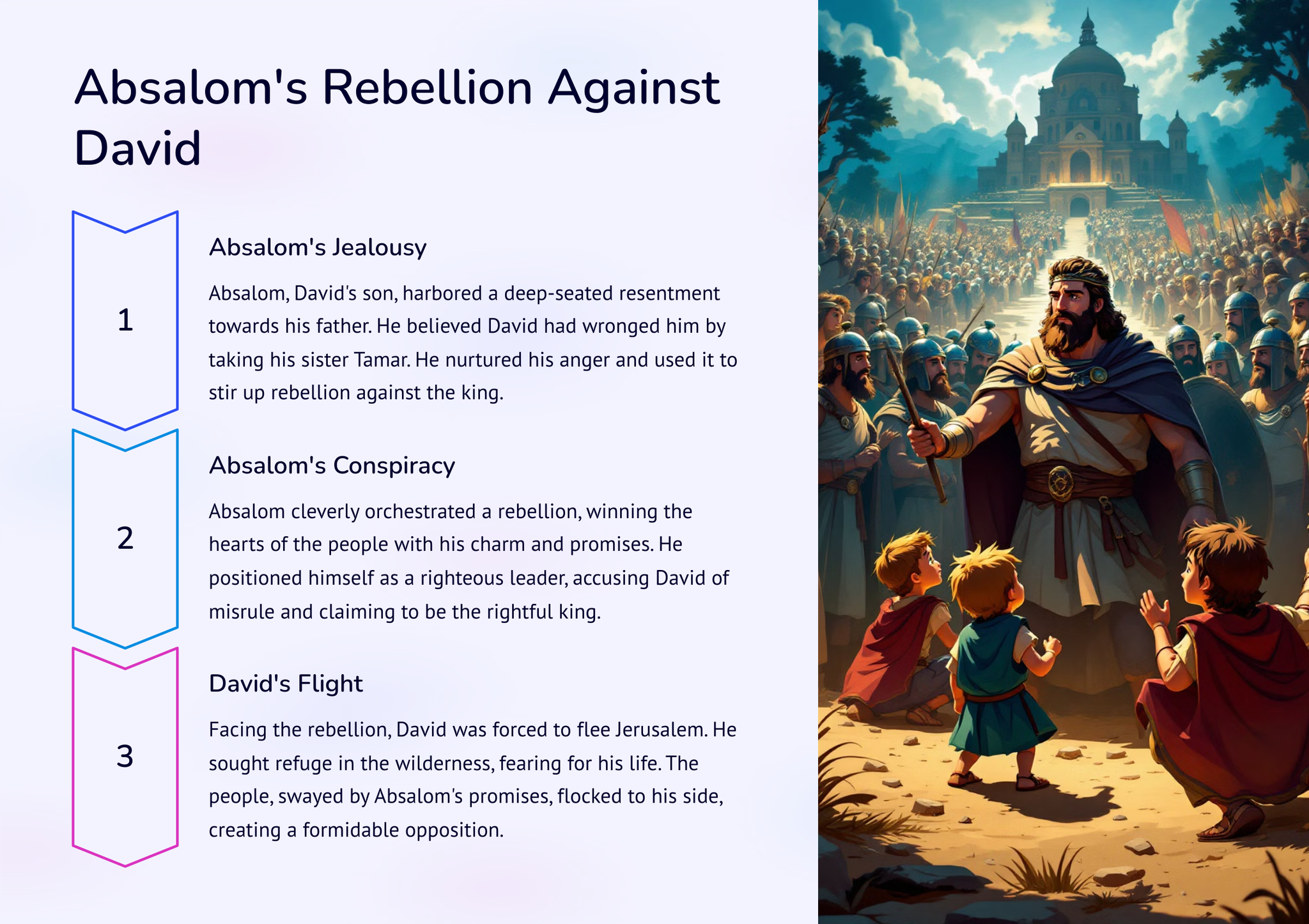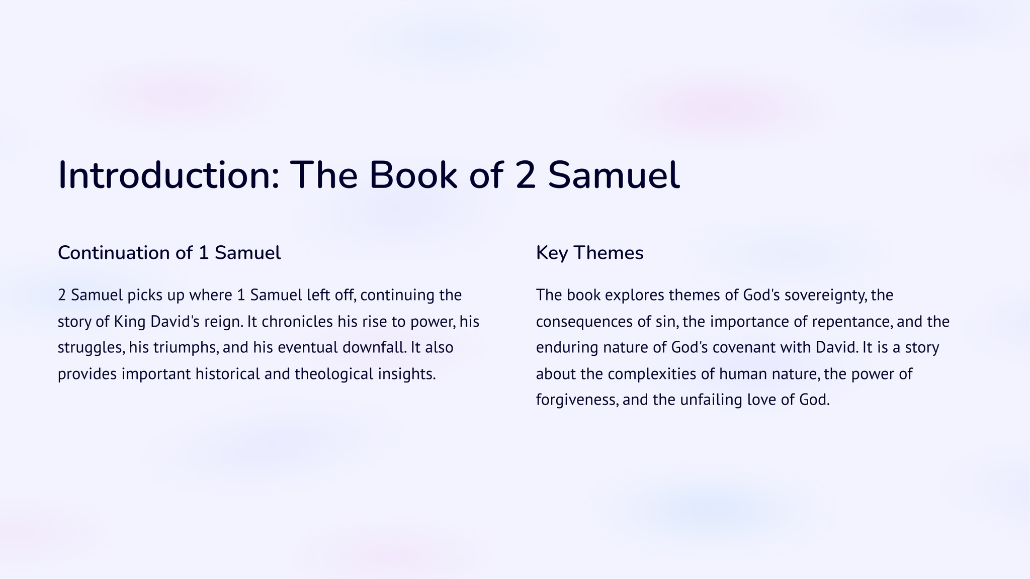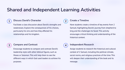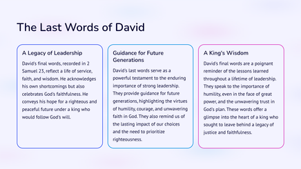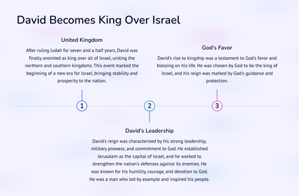 Kry 'n dieper begrip van die opkoms van koningskap in antieke Israel met 2 Samuel: Van koning Dawid tot koningskap. Verken die storie en gebeure wat tot hierdie betekenisvolle oorgang gelei het deur die lens van koning Dawid se bewind. Kry insig in hierdie deurslaggewende tydperk in die Bybelse geskiedenis.