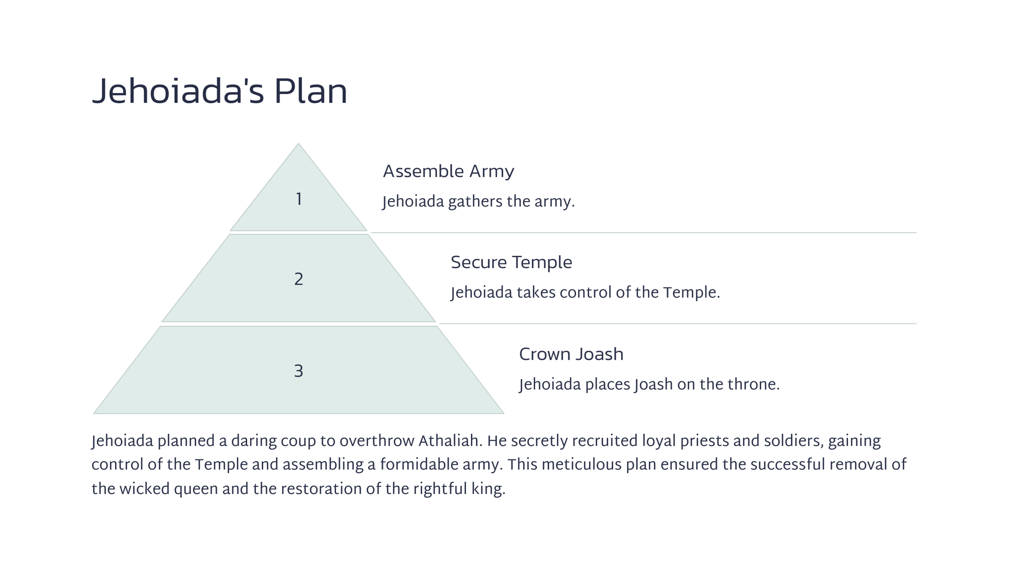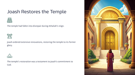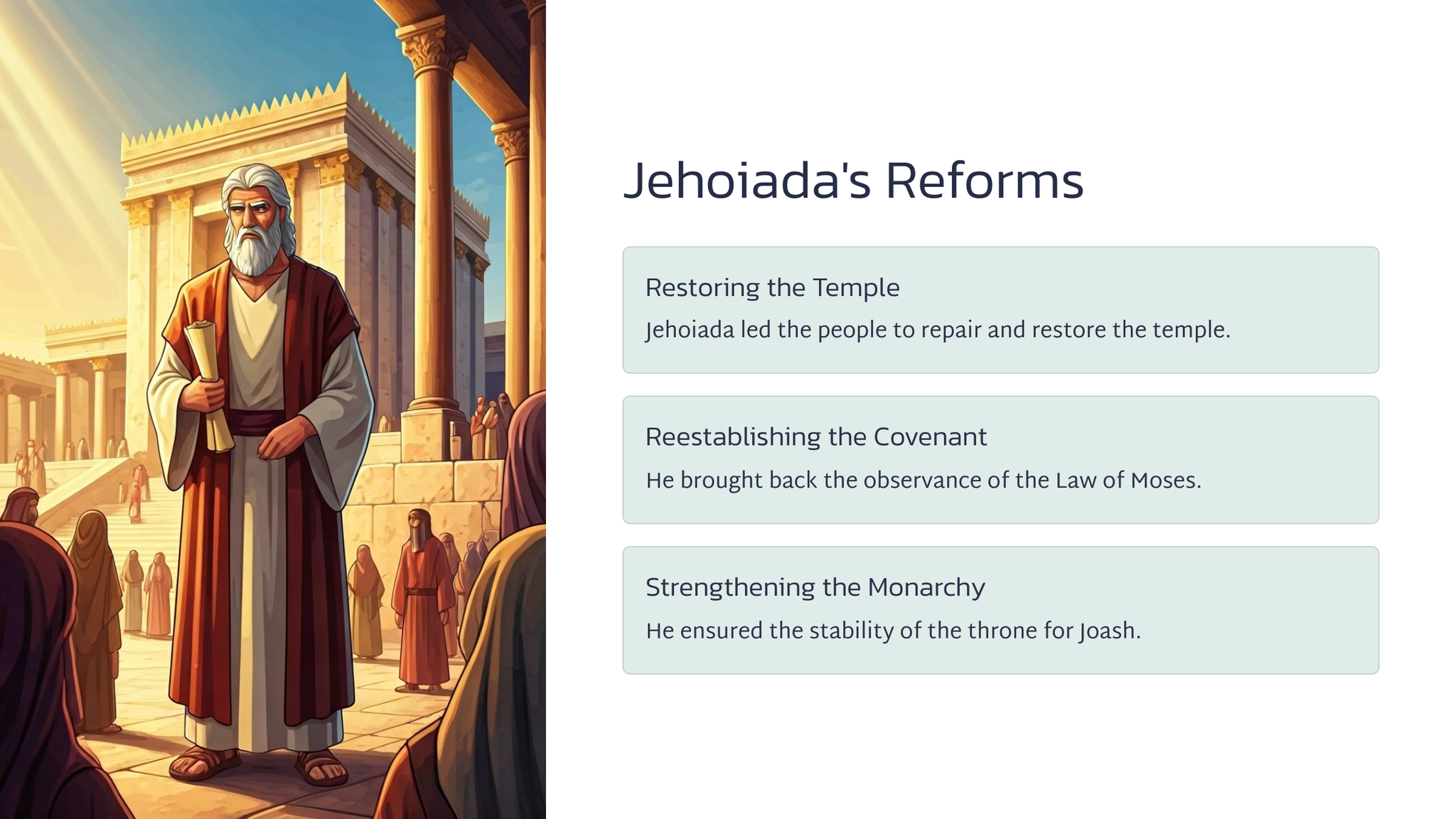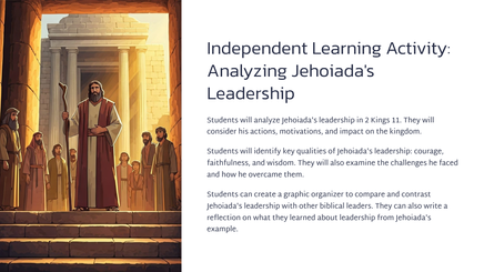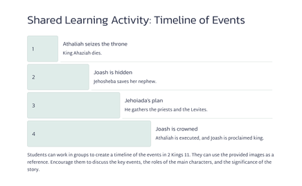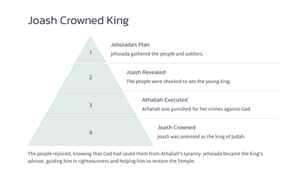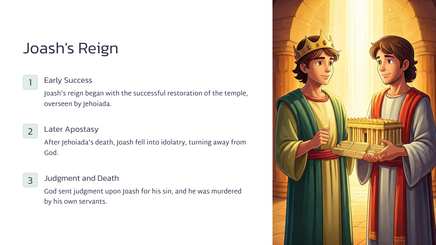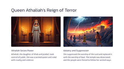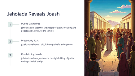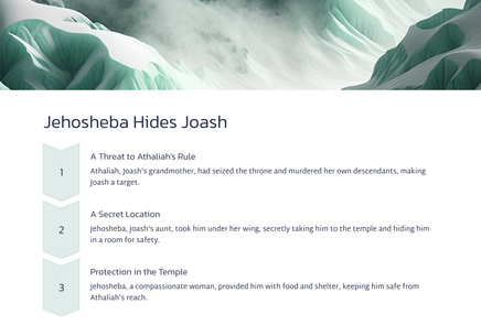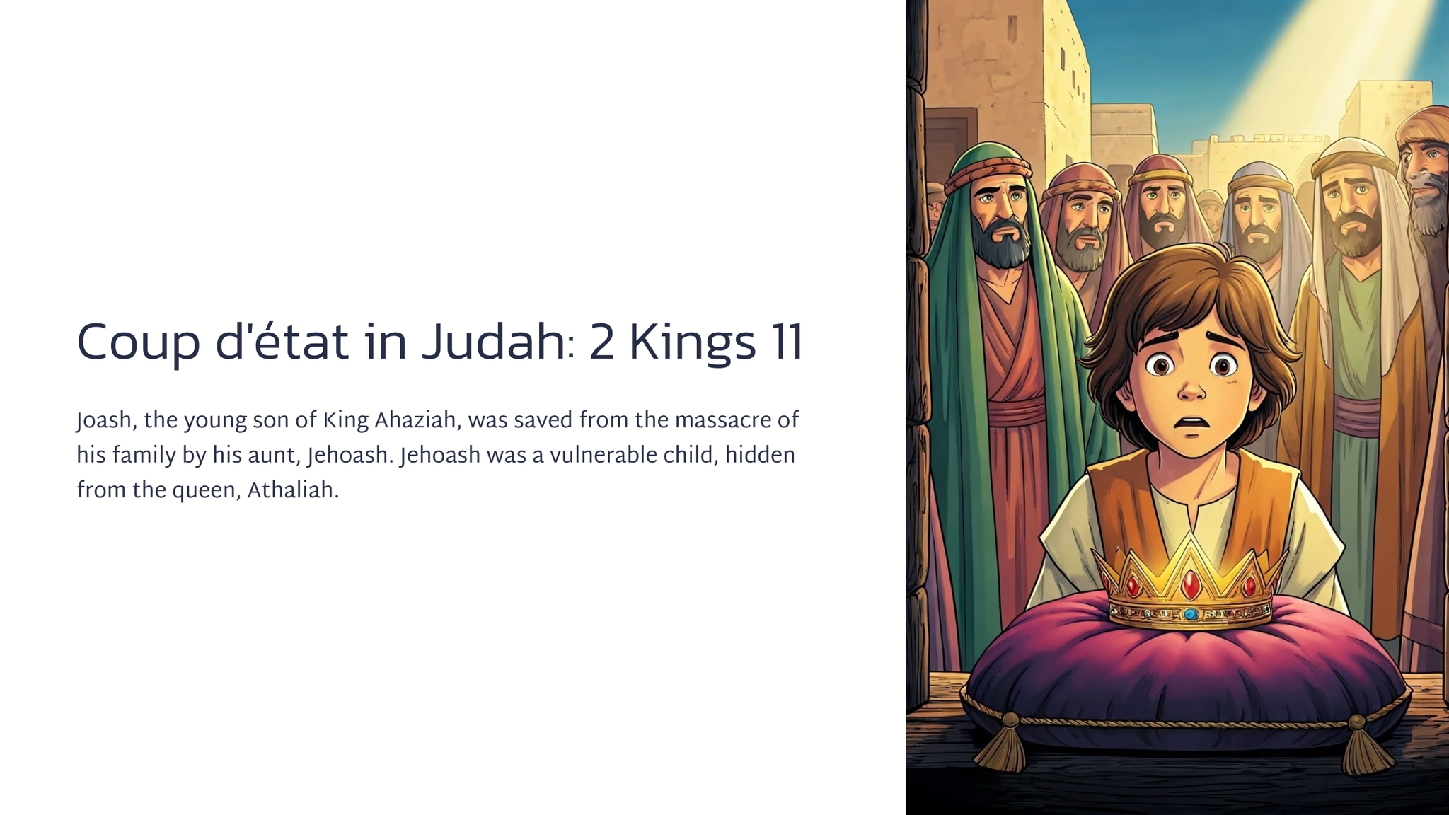 Joas, die jong seun van koning Ahasia, is deur sy tante, Joas, van die slagting van sy familie gered. Joas was 'n kwesbare kind, weggesteek vir die koningin, Atalia.
