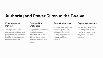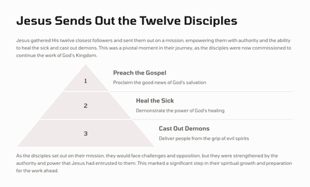 Jesus commissions the Twelve Disciples to go out and spread his teachings, heal the sick, and cast out demons. This marked a pivotal moment in their journey as Jesus' trusted followers.