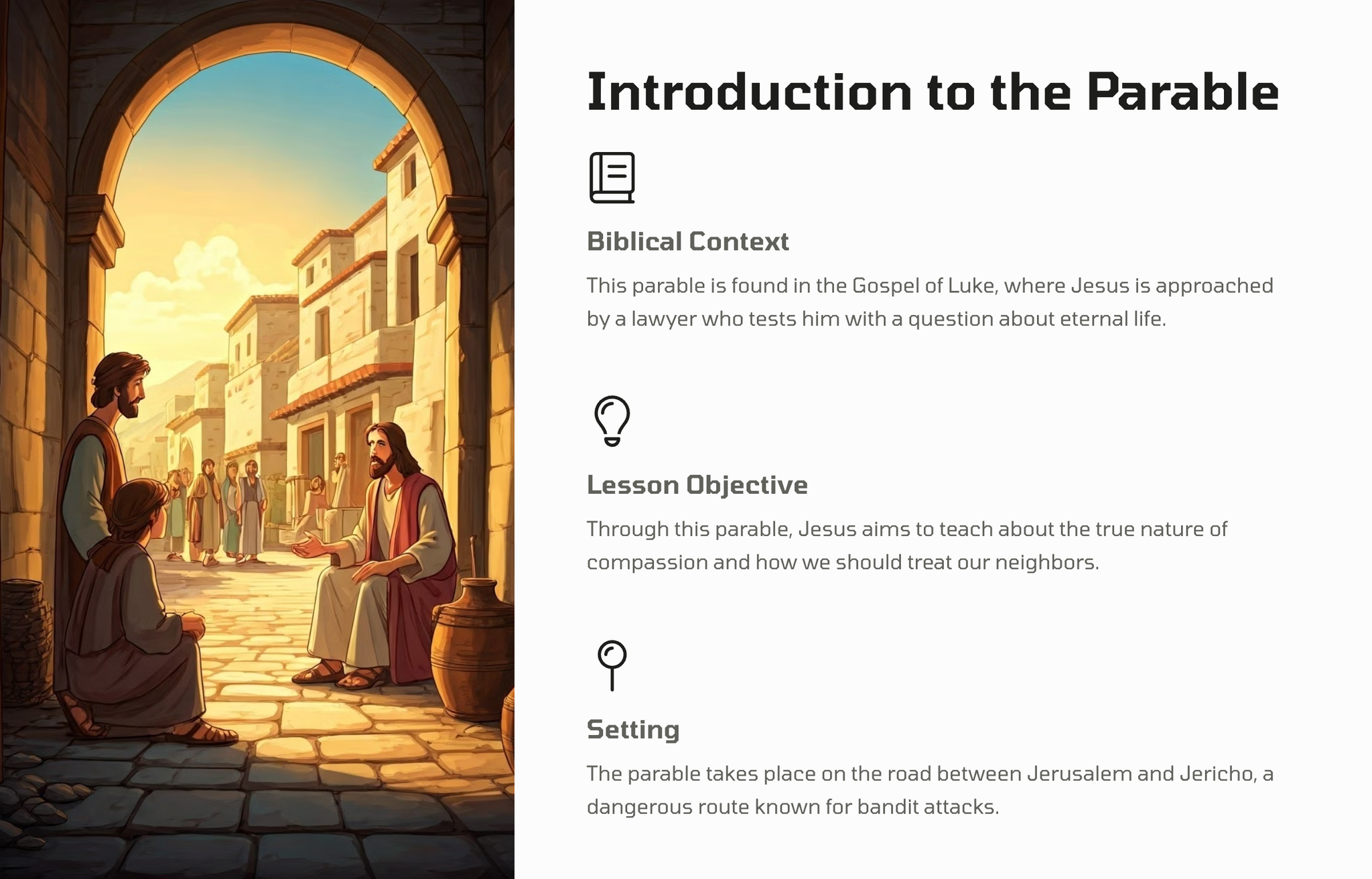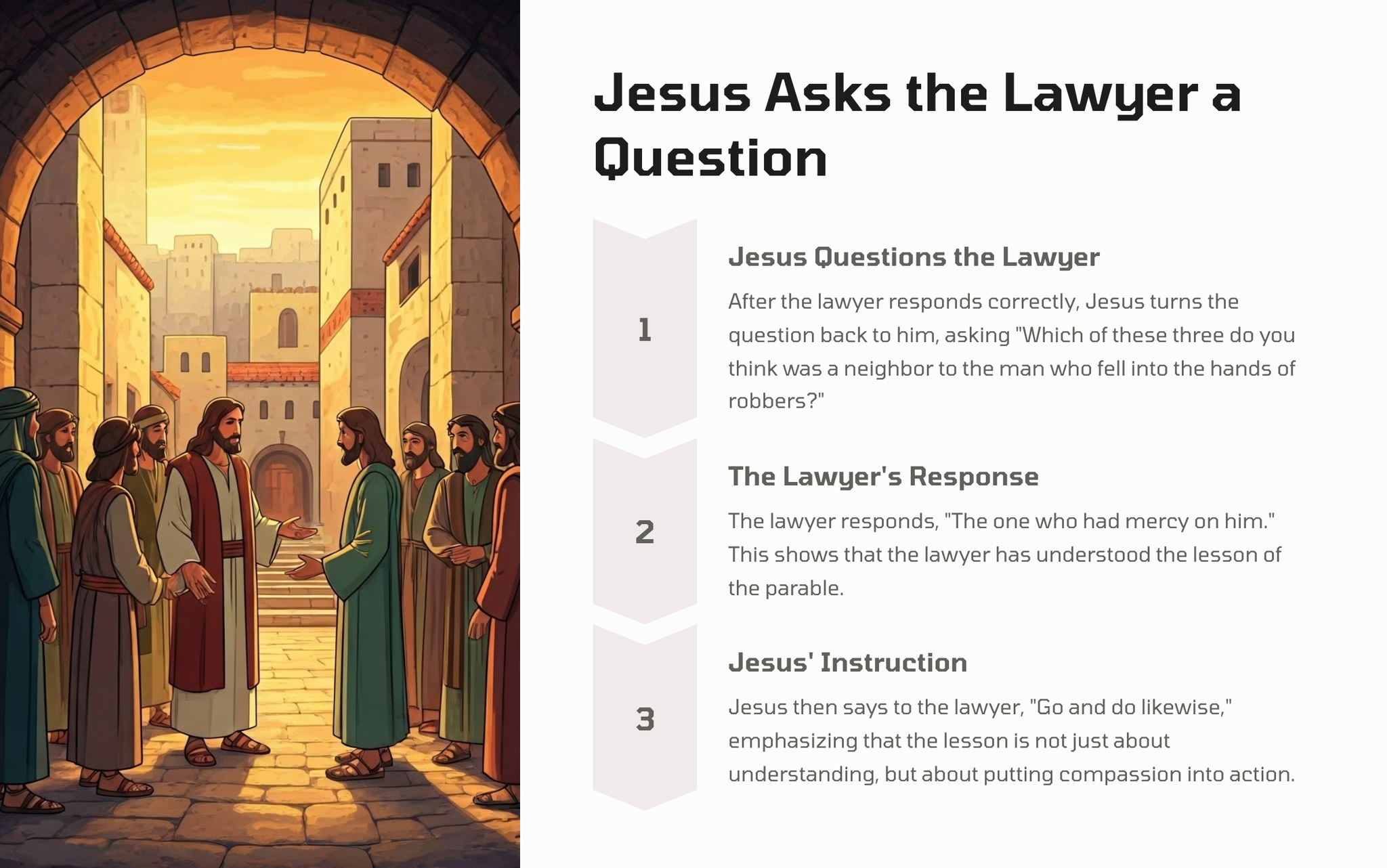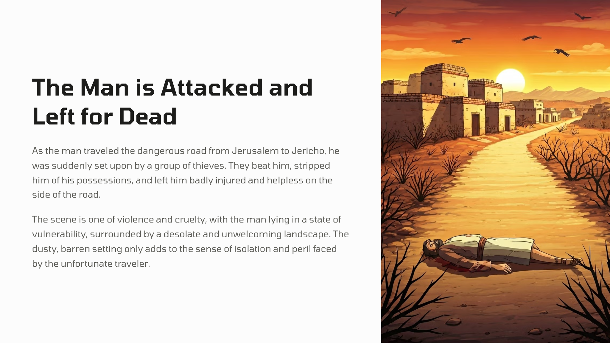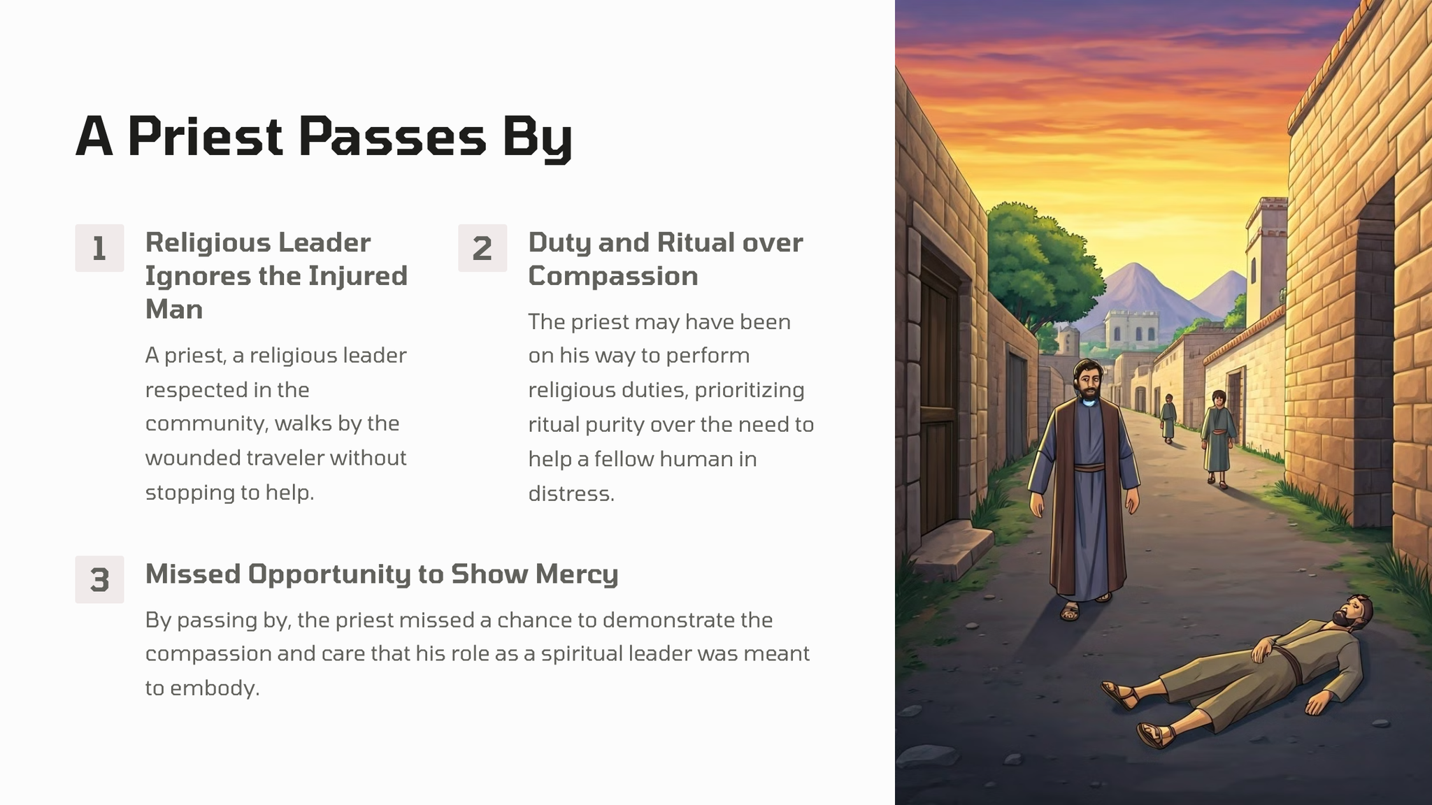 In this well-known parable, Jesus tells the story of a man who is attacked and left for dead on the road. The response of the religious leaders contrasts sharply with that of a Samaritan traveler, who stops to provide compassionate aid.
