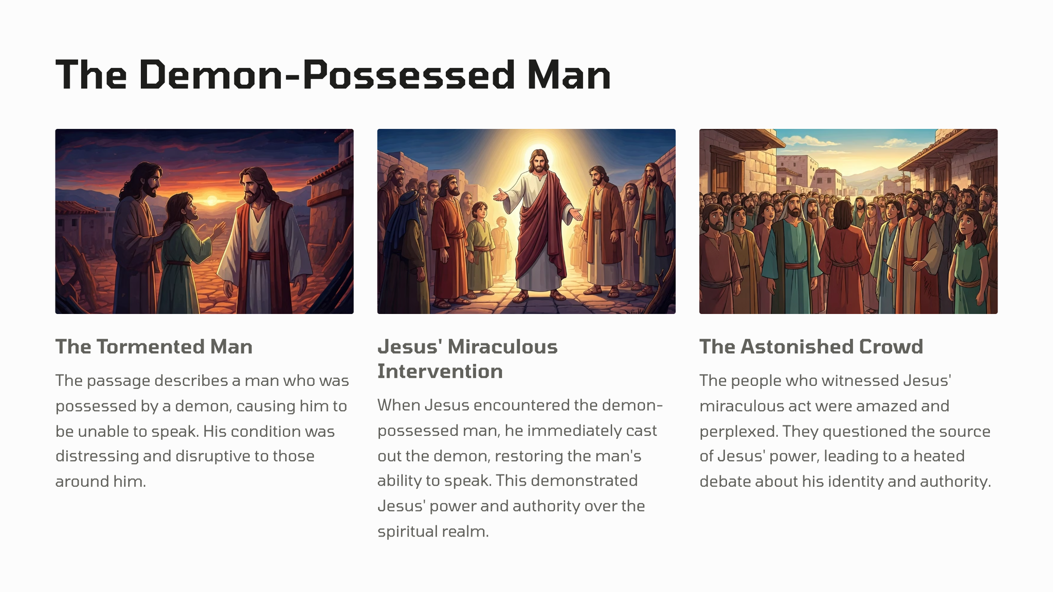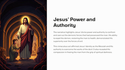 In this passage, Jesus demonstrates his power over evil spirits by driving out a demon from a man, showcasing his divine authority and ability to free those oppressed by the forces of darkness.