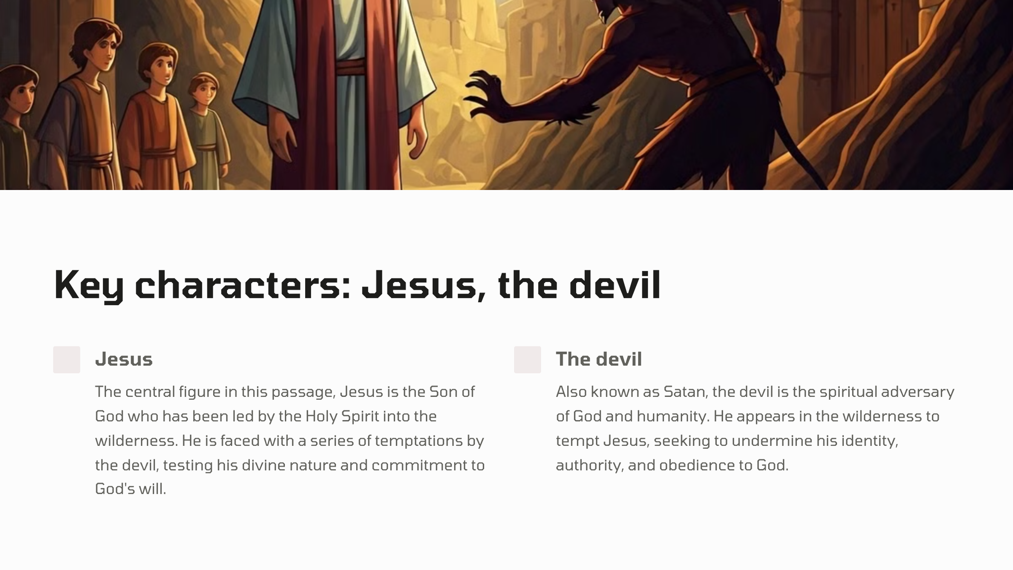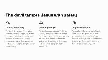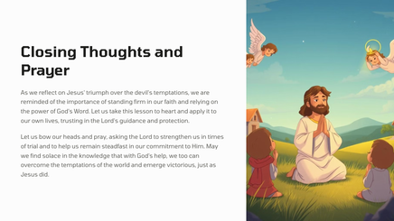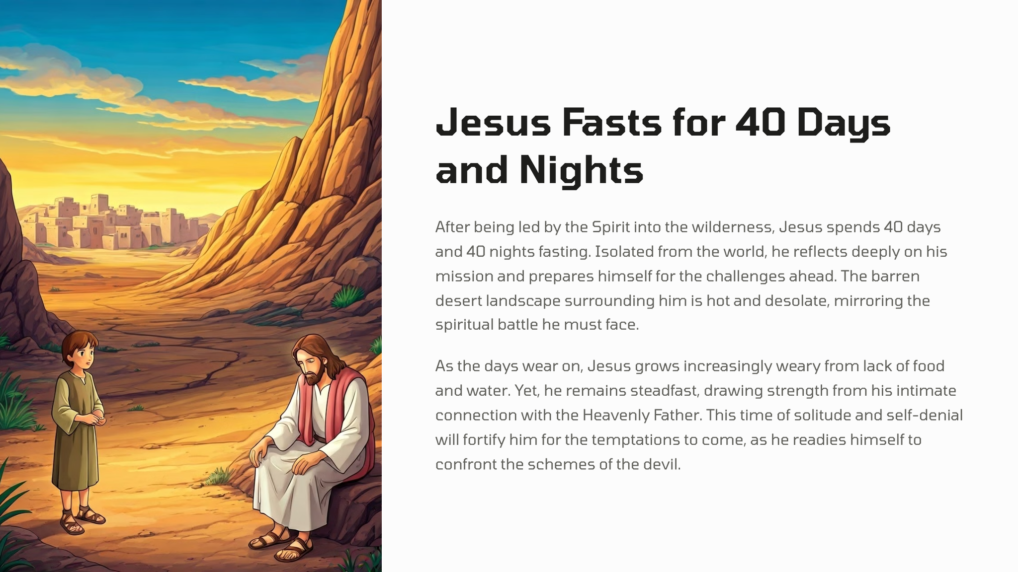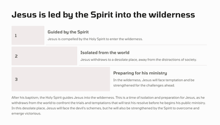 After his baptism, Jesus was led by the Spirit into the wilderness to be tempted by the devil. For forty days and forty nights, he fasted and endured the trials set before him, emerging victorious in his faith and obedience to God.