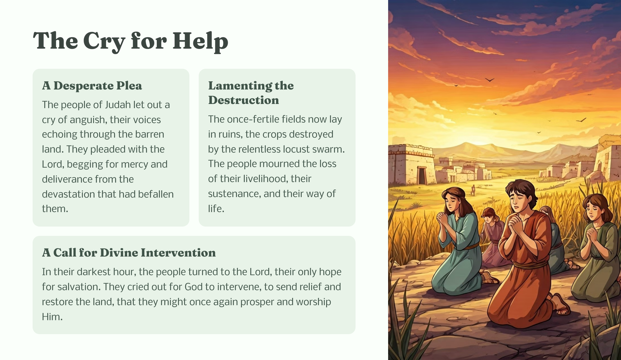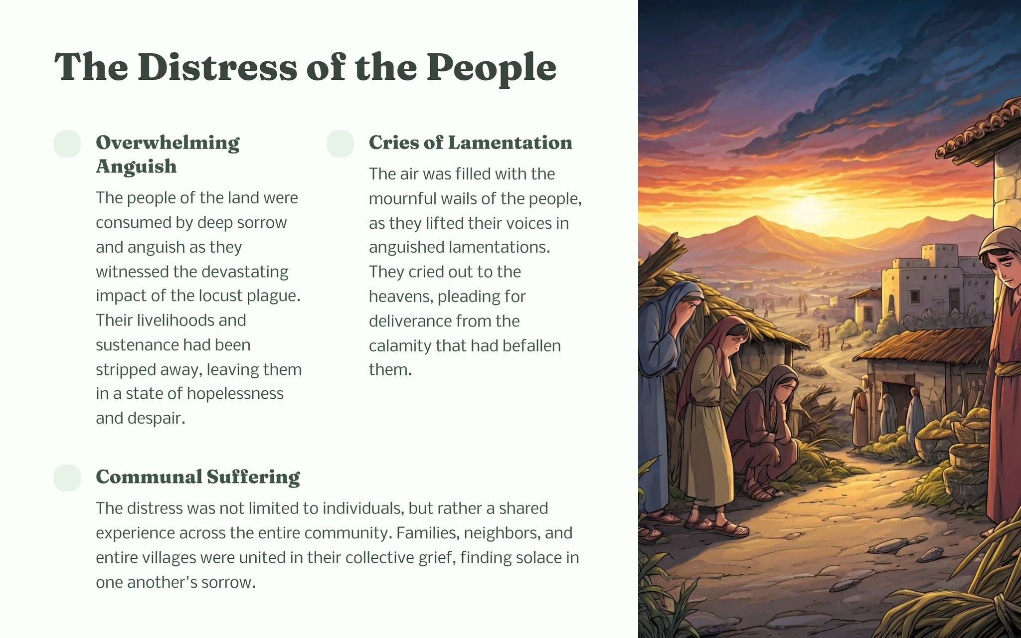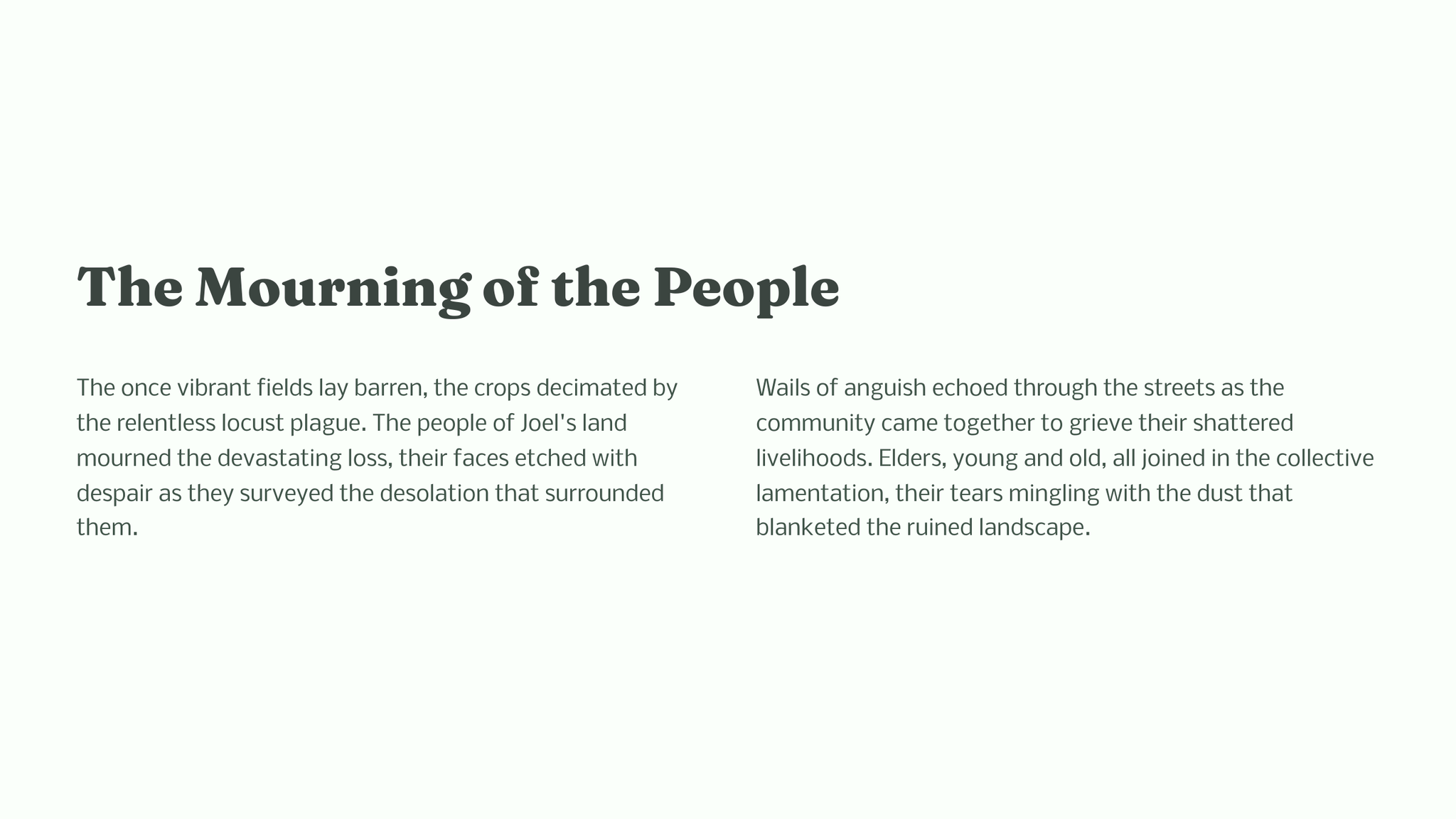 Joel, a prophet of God, delivers a sobering message to the people of Judah about the impending judgment they will face. The chapter opens with a vivid description of a devastating locust plague that has ravaged the land, foreshadowing greater calamities to come.