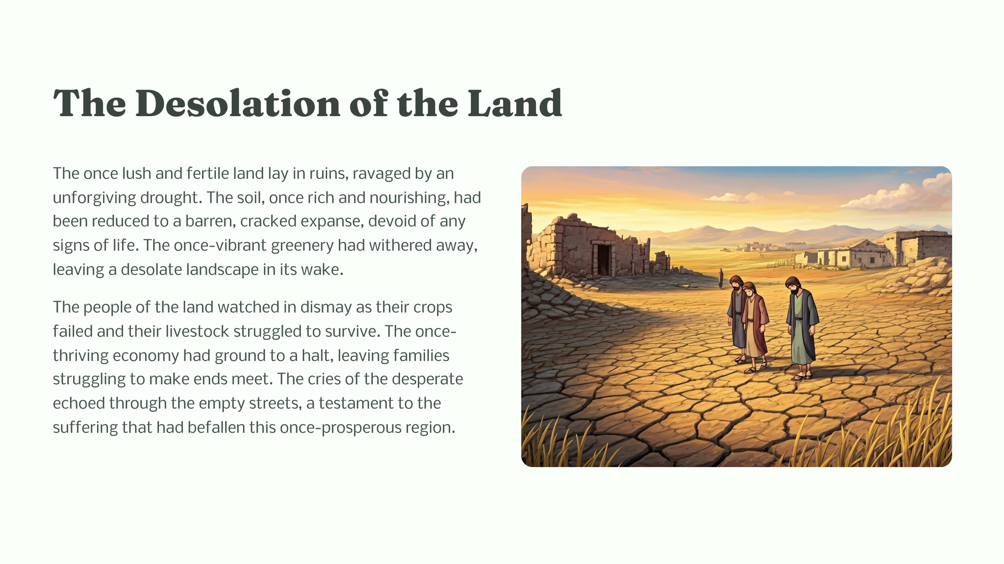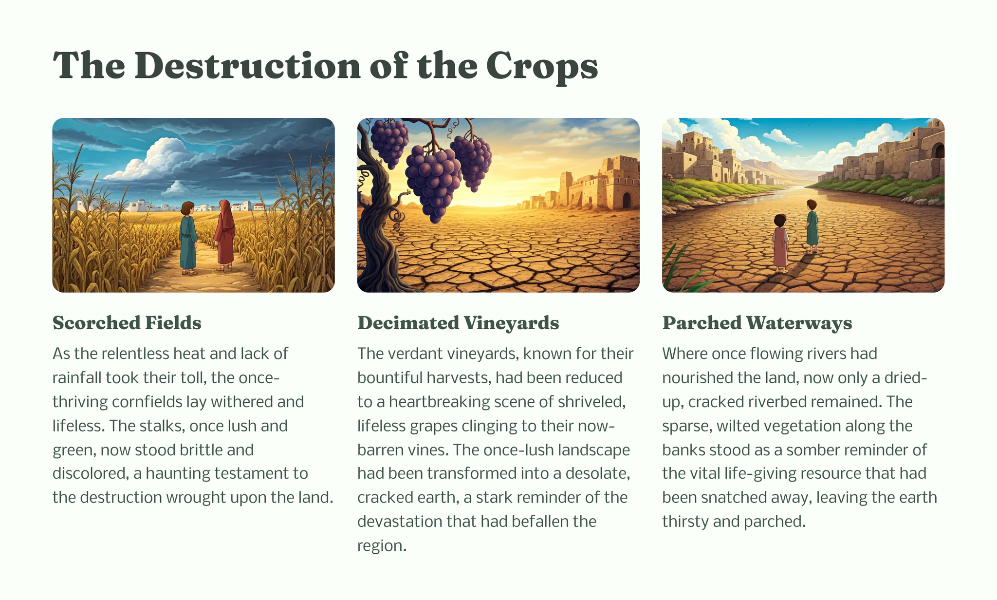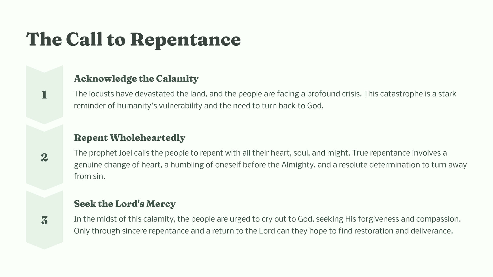 Joel, a prophet of God, delivers a sobering message to the people of Judah about the impending judgment they will face. The chapter opens with a vivid description of a devastating locust plague that has ravaged the land, foreshadowing greater calamities to come.
