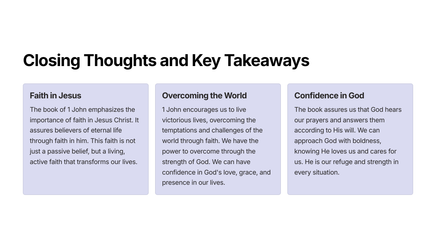 This chapter is filled with practical teachings, emphasizing the importance of walking in the light, overcoming the world, and abiding in the truth. The epistle concludes with a powerful affirmation of the Trinity, emphasizing the importance of faith, hope, and love as essential virtues for believers.
