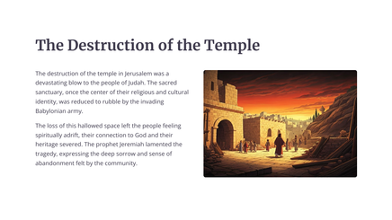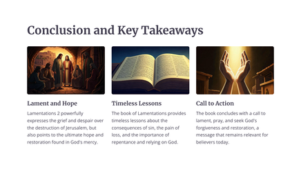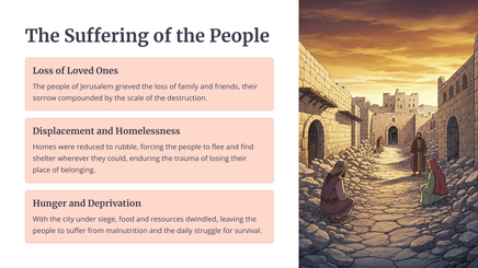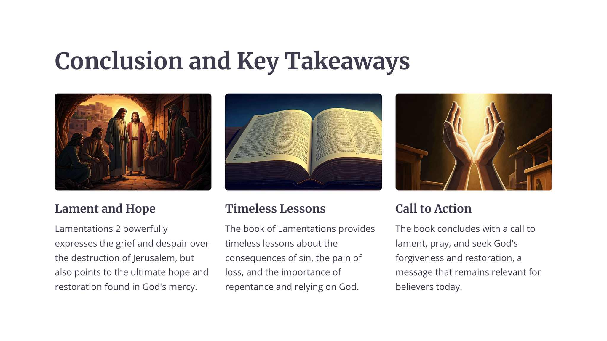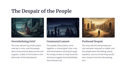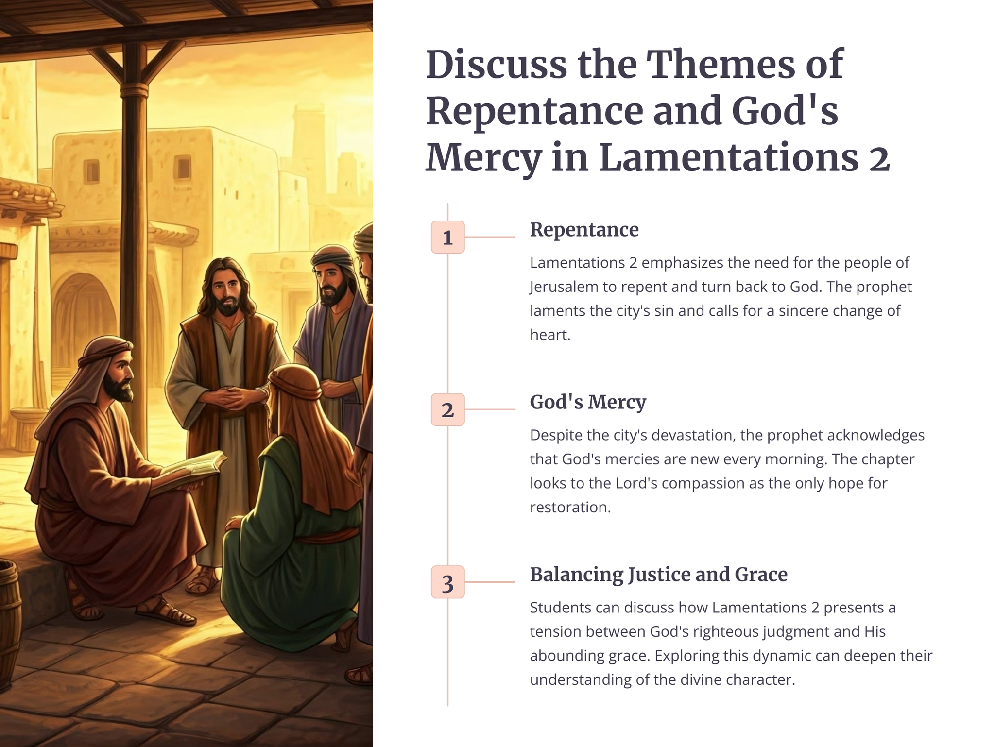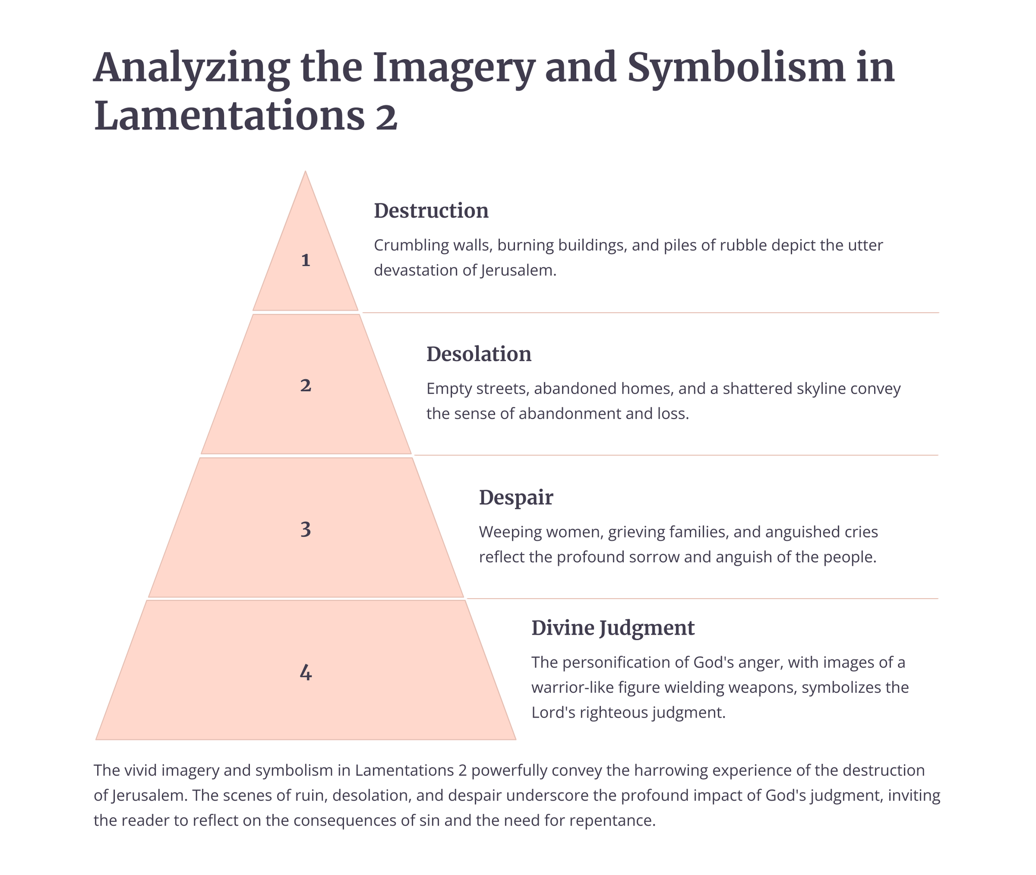 Lamentations 2 expresses the prophet's anguish over the destruction of Jerusalem and the suffering of the people. It is a heartfelt plea for God's compassion and restoration in the midst of profound grief and despair.