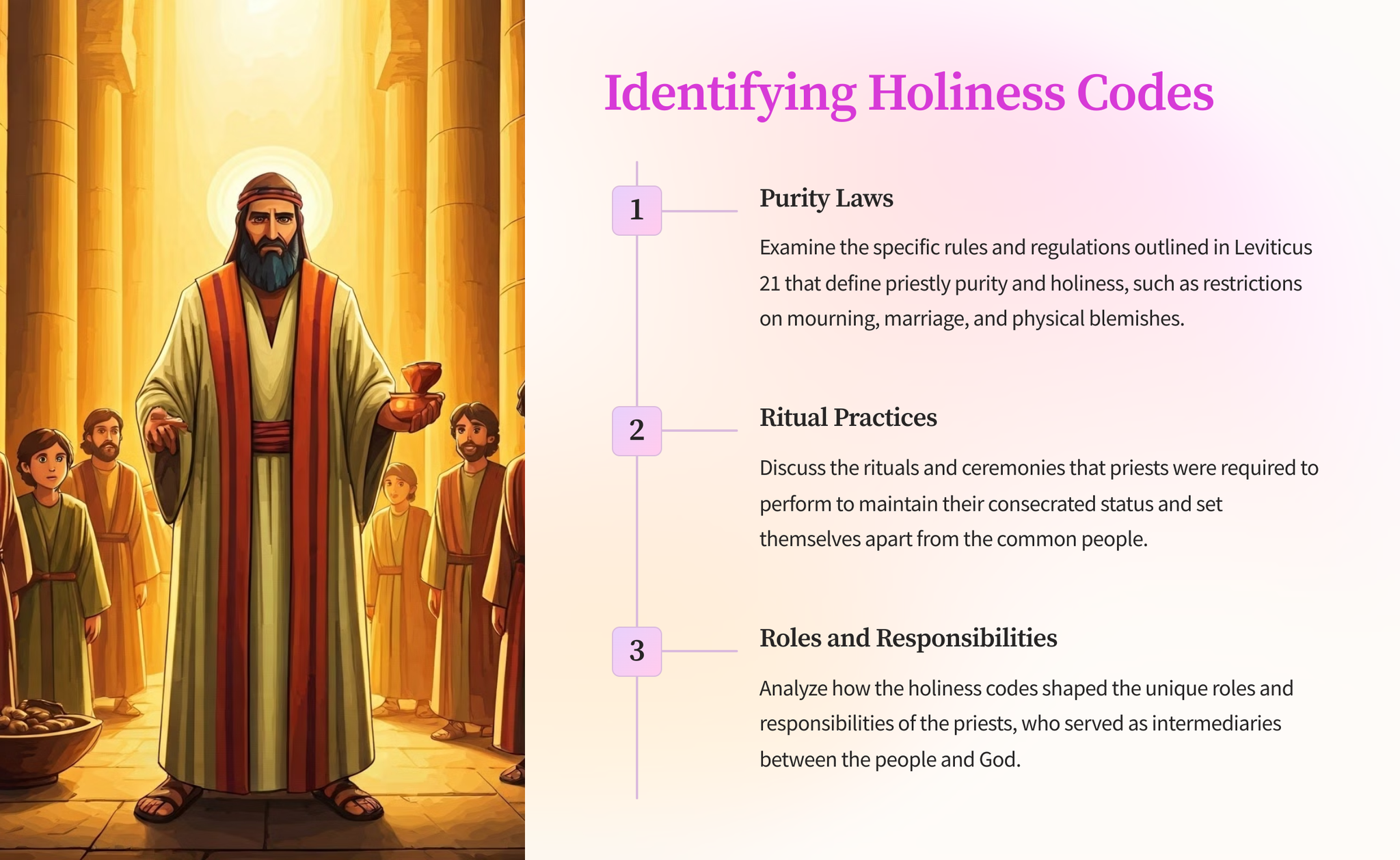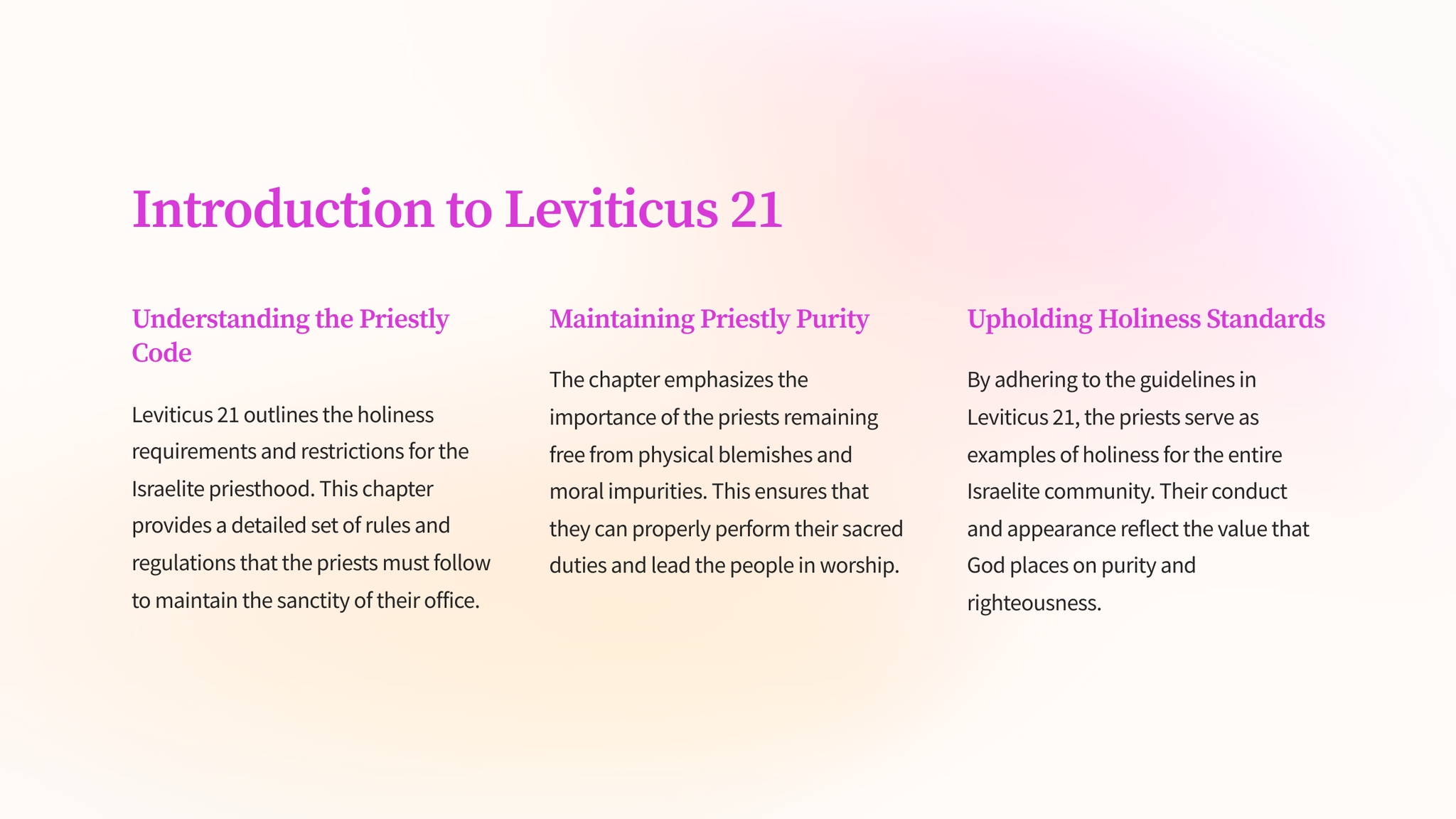 This section from the book of Leviticus outlines the standards of holiness and purity required for the priests who serve in God's tabernacle. It provides guidance on moral conduct, physical appearance, and ritual practices.