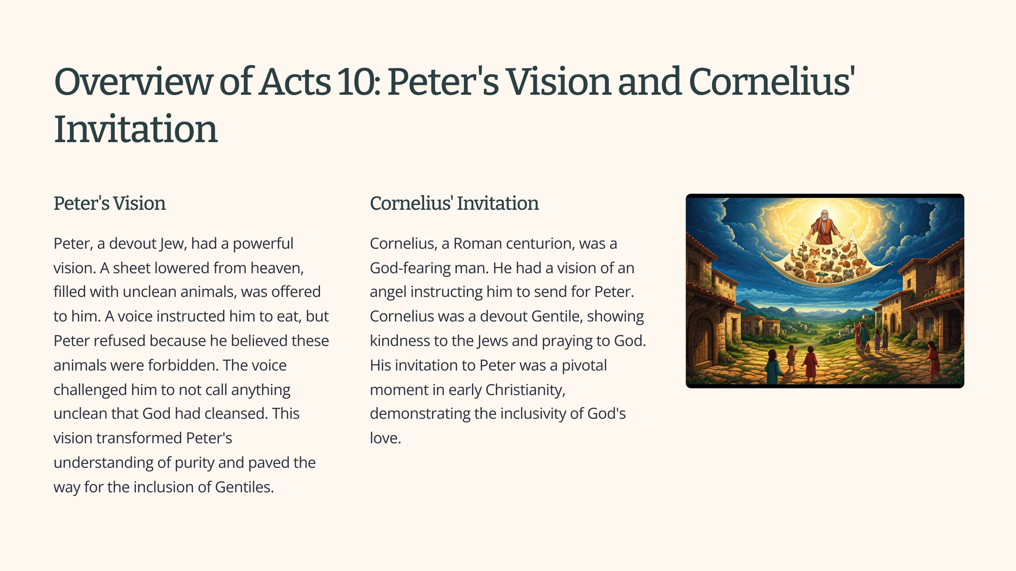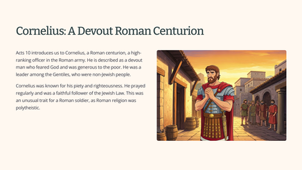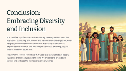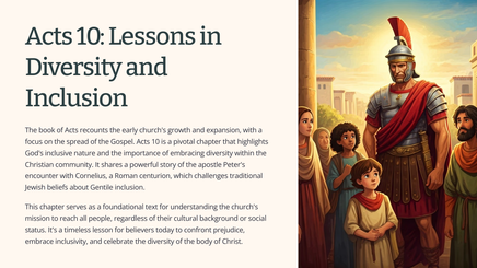 The book of Acts recounts the early church's growth and expansion, with a focus on the spread of the Gospel. Acts 10 is a pivotal chapter that highlights God's inclusive nature and the importance of embracing diversity within the Christian community. It shares a powerful story of the apostle Peter's encounter with Cornelius, a Roman centurion, which challenges traditional Jewish beliefs about Gentile inclusion.