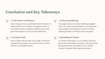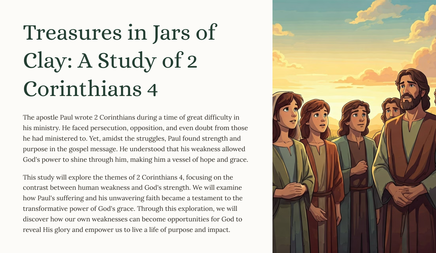 This study will explore the themes of 2 Corinthians 4, focusing on the contrast between human weakness and God's strength. We will examine how Paul's suffering and his unwavering faith became a testament to the transformative power of God's grace. Through this exploration, we will discover how our own weaknesses can become opportunities for God to reveal His glory and empower us to live a life of purpose and impact.