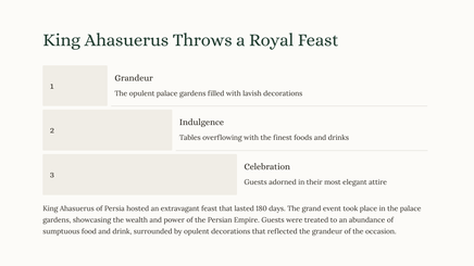 Discover the lavish celebration hosted by King Ahasuerus, showcasing the opulence and power of the Persian Empire during the reign of Esther in the Bible.