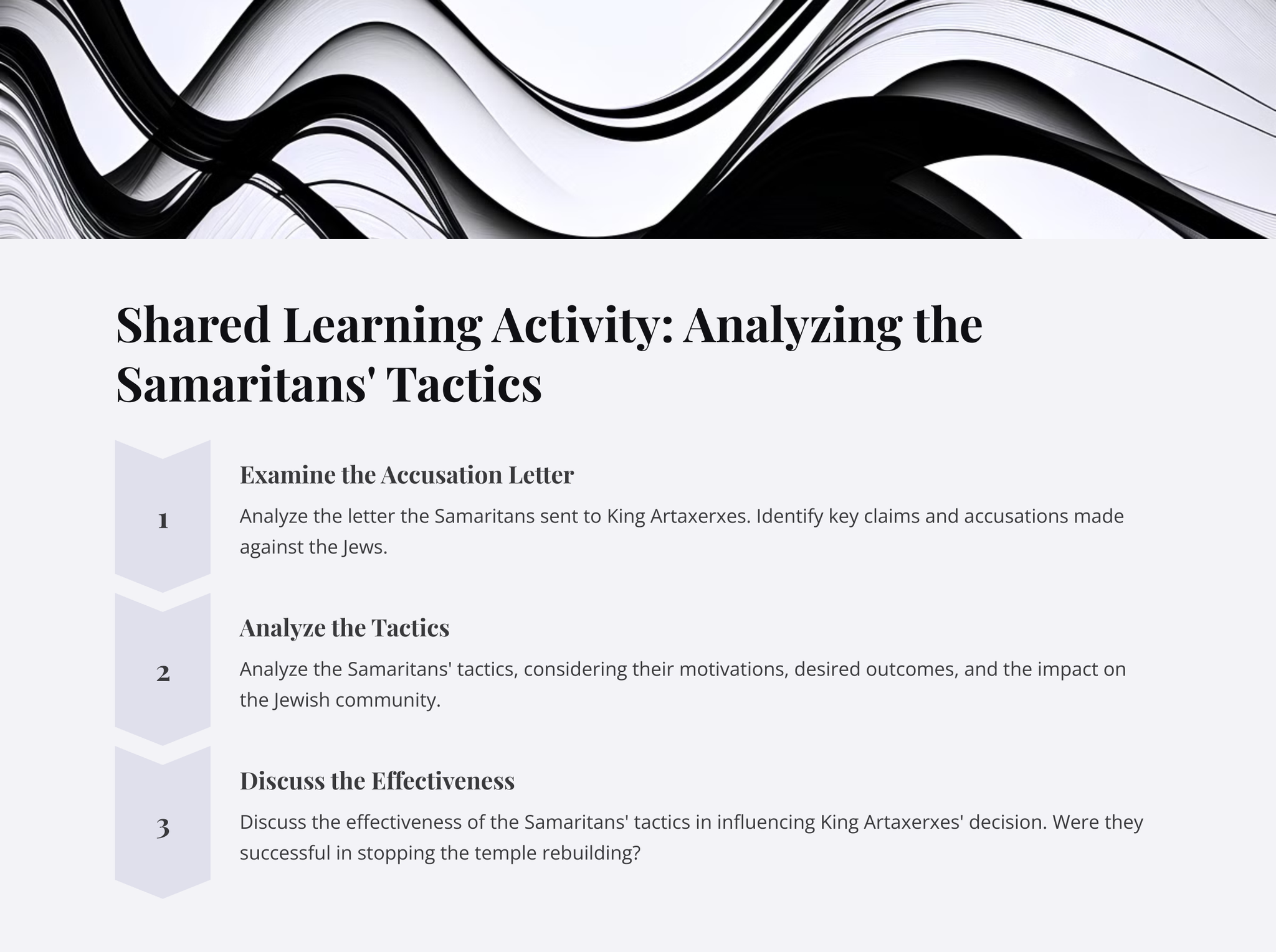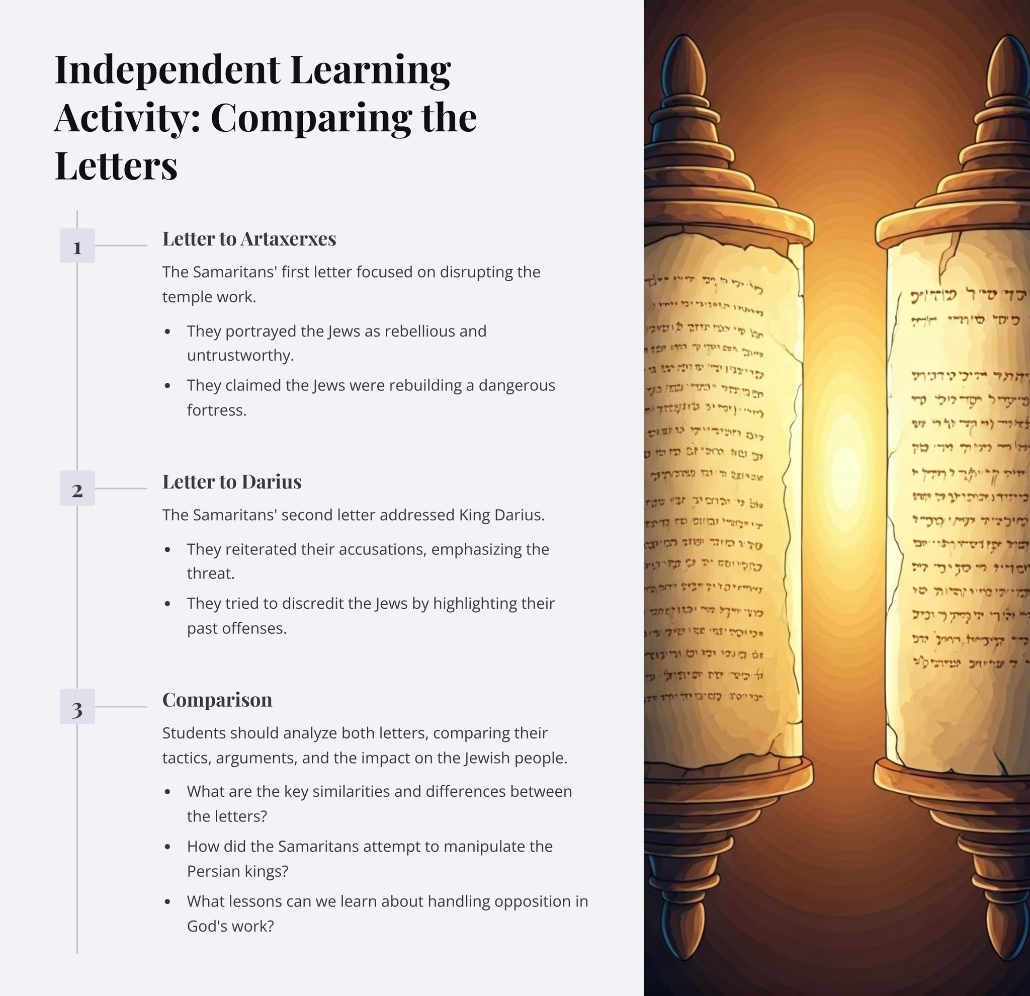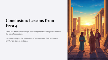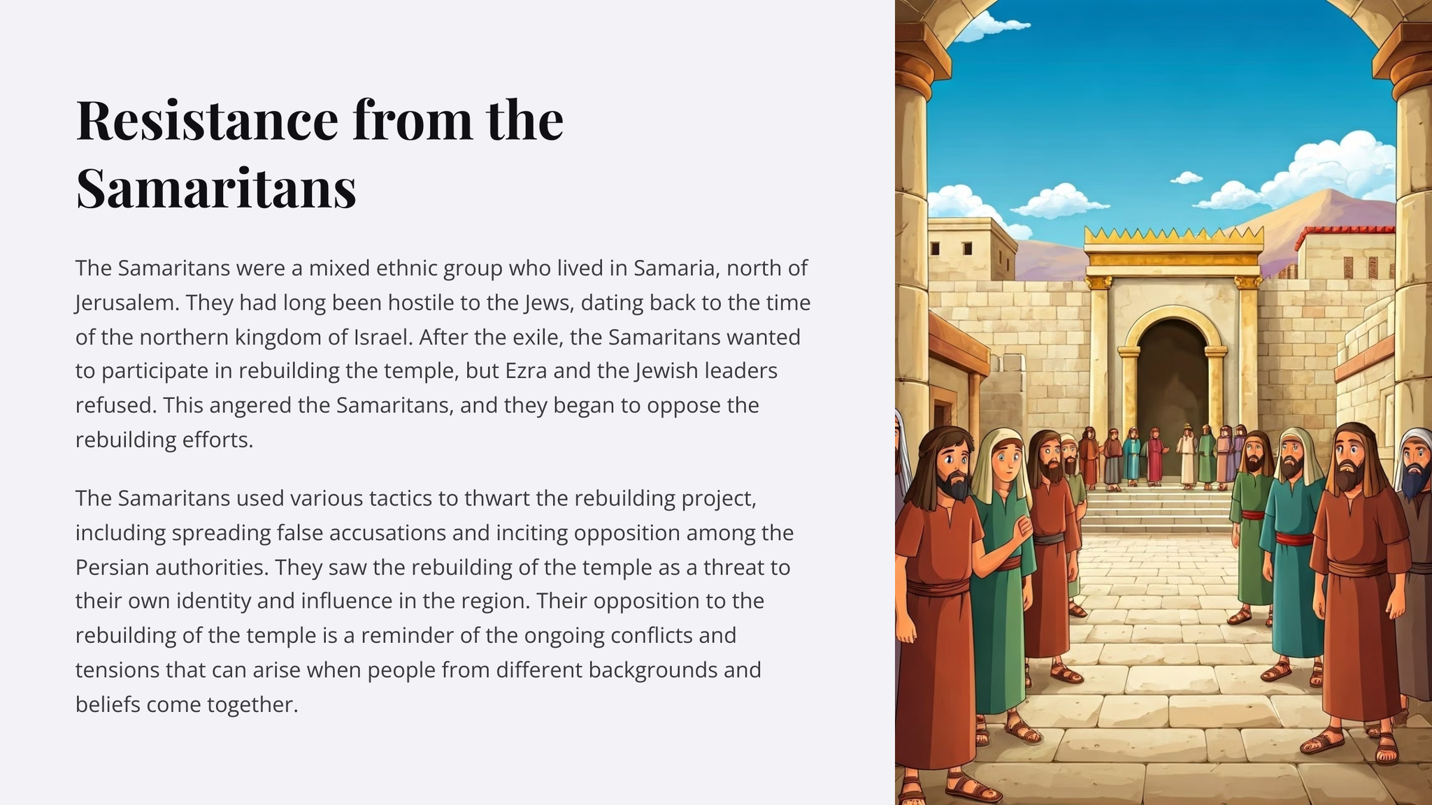 The Israelites returned to Jerusalem and began rebuilding the temple, but faced opposition from their neighbors. They were discouraged and delayed in their work.