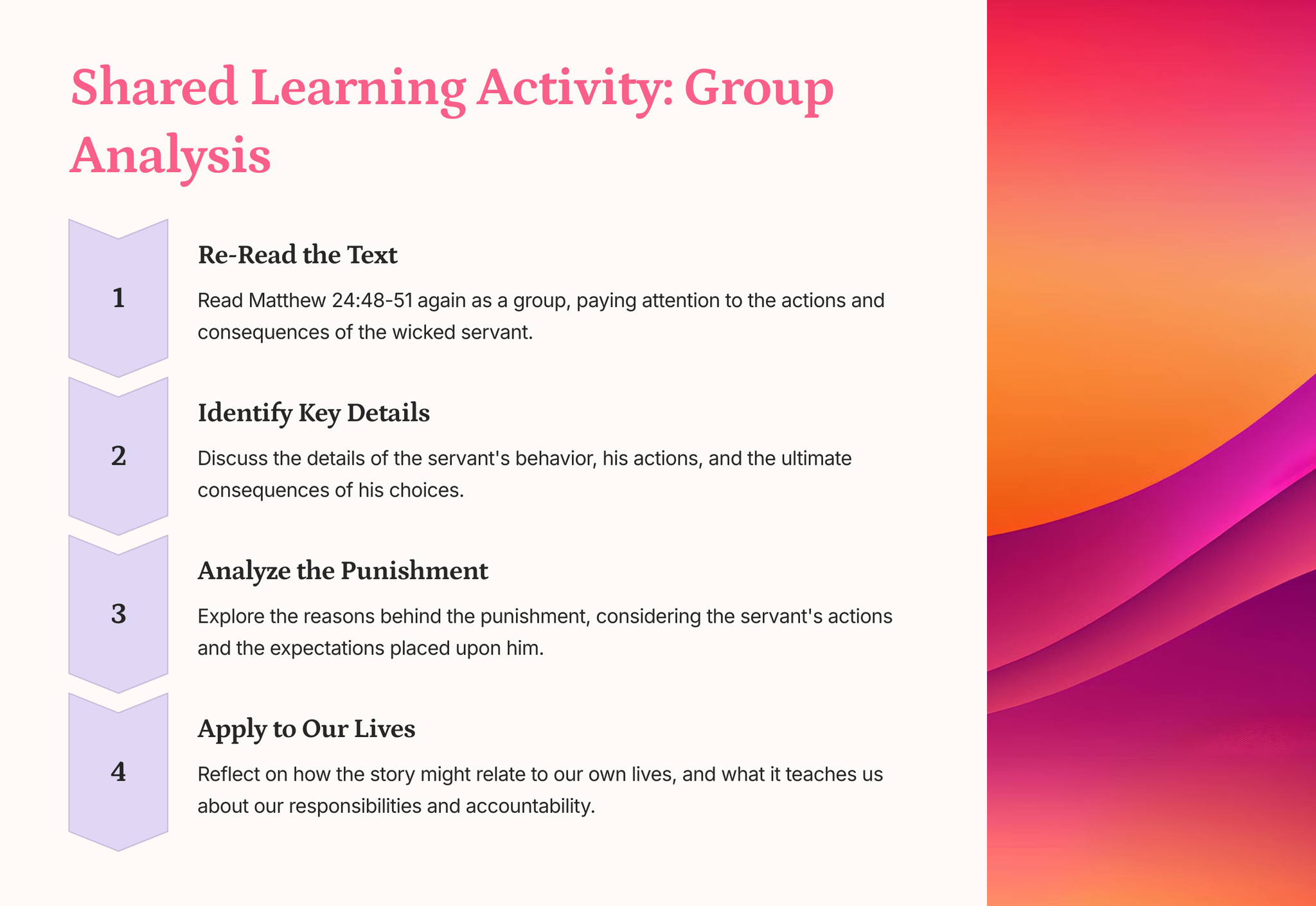 The parable in Matthew 24:36-51 teaches about the importance of being ready for the return of Jesus.