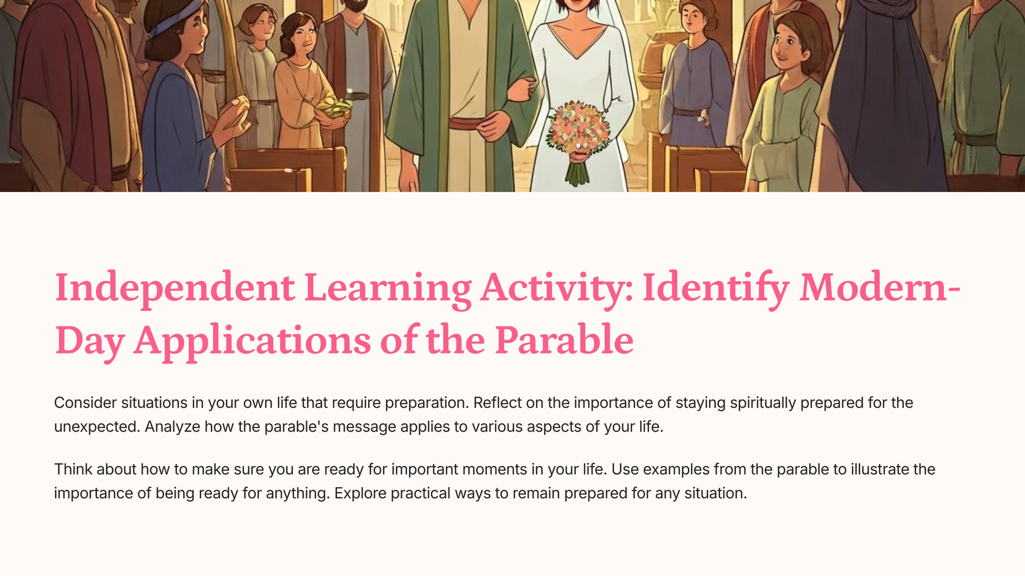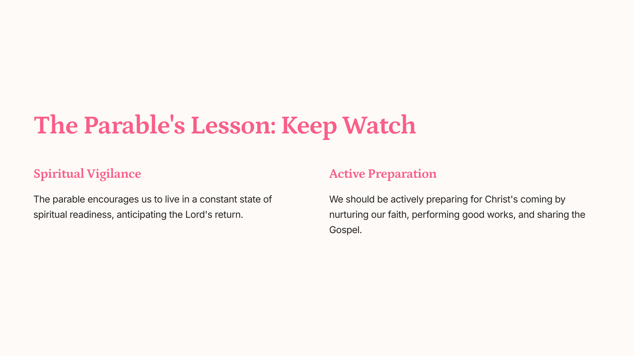 This parable teaches about preparedness and readiness for Jesus’ return. It highlights the importance of being spiritually vigilant.
