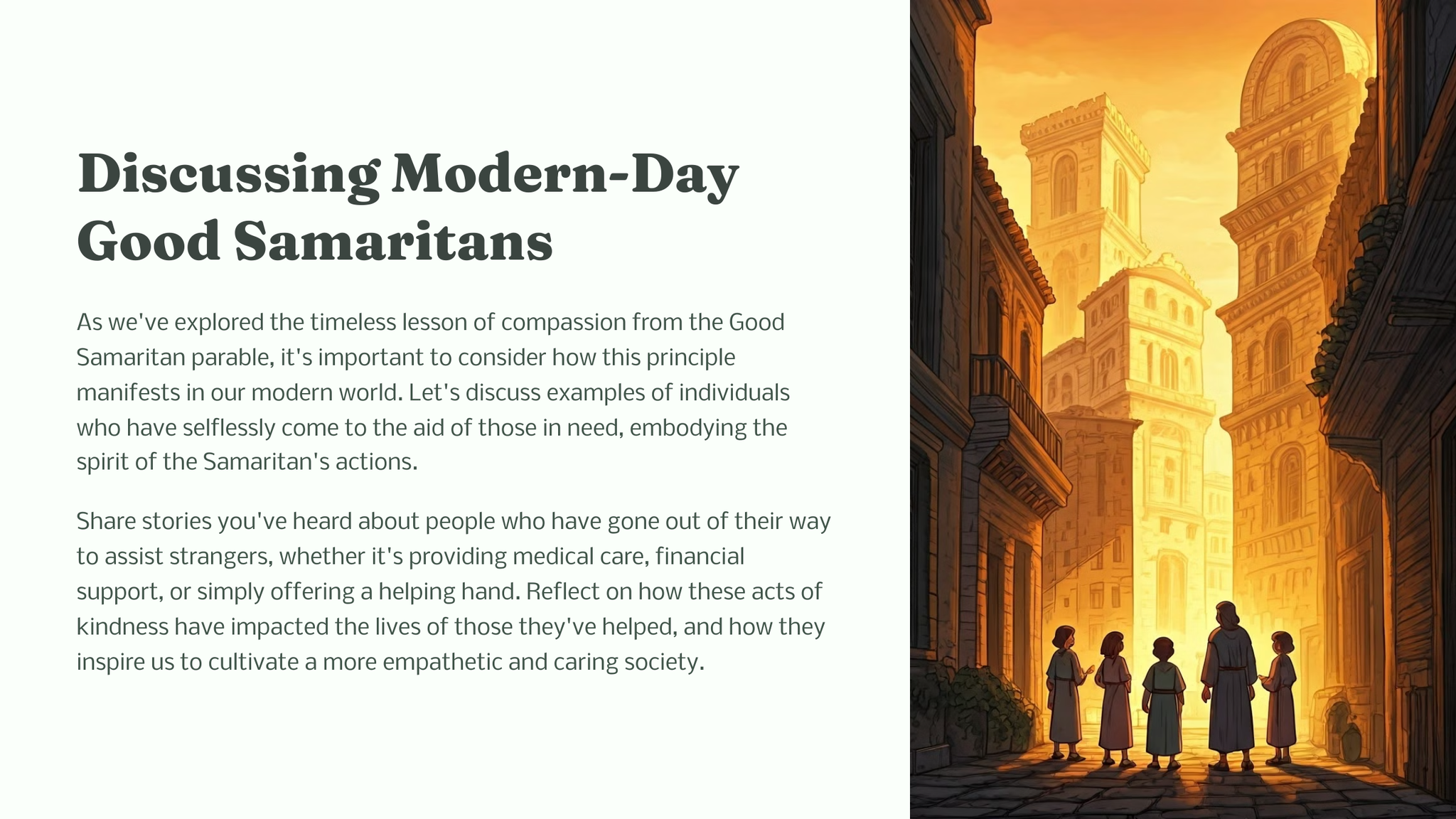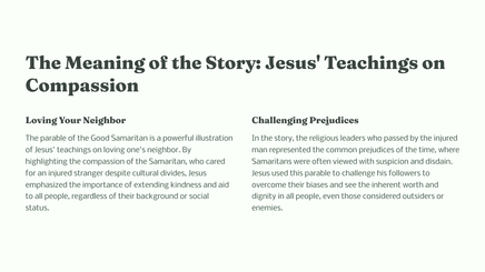 In this iconic parable, Jesus tells the story of a man who is attacked and left for dead on the road. Two religious leaders pass him by, but a Samaritan stranger stops to help, providing care and ensuring the man's safety. This timeless tale illustrates the importance of compassion, kindness, and selflessly assisting those in need, regardless of social or religious differences.