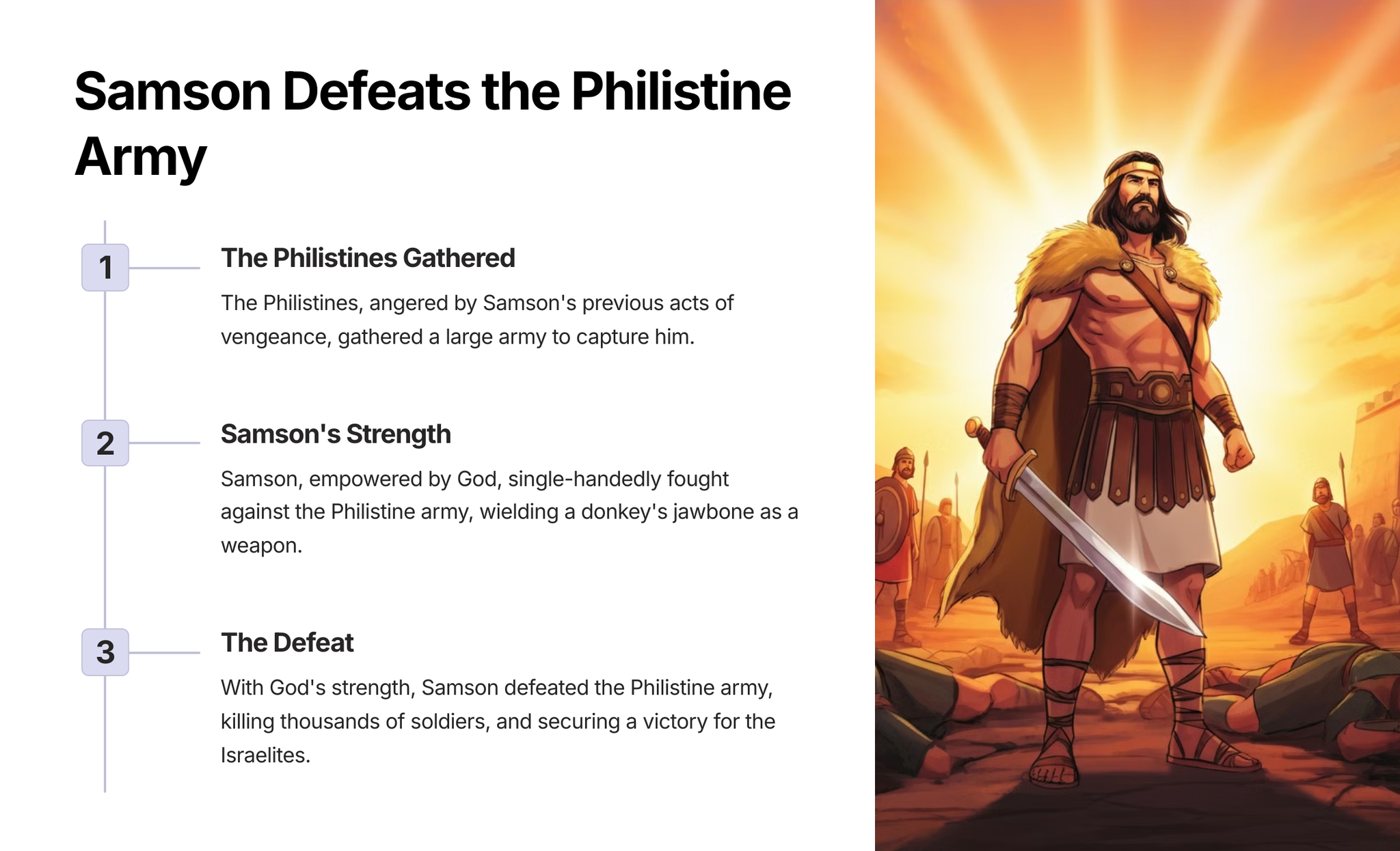 This unit explores the story of Samson's vengeance against the Philistines, revealing the consequences of his actions and highlighting themes of strength, weakness, and the dangers of uncontrolled power.
