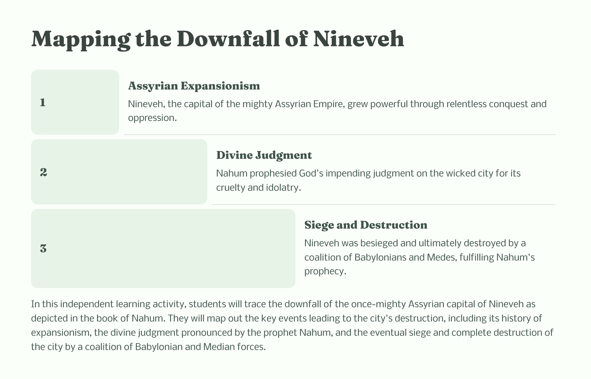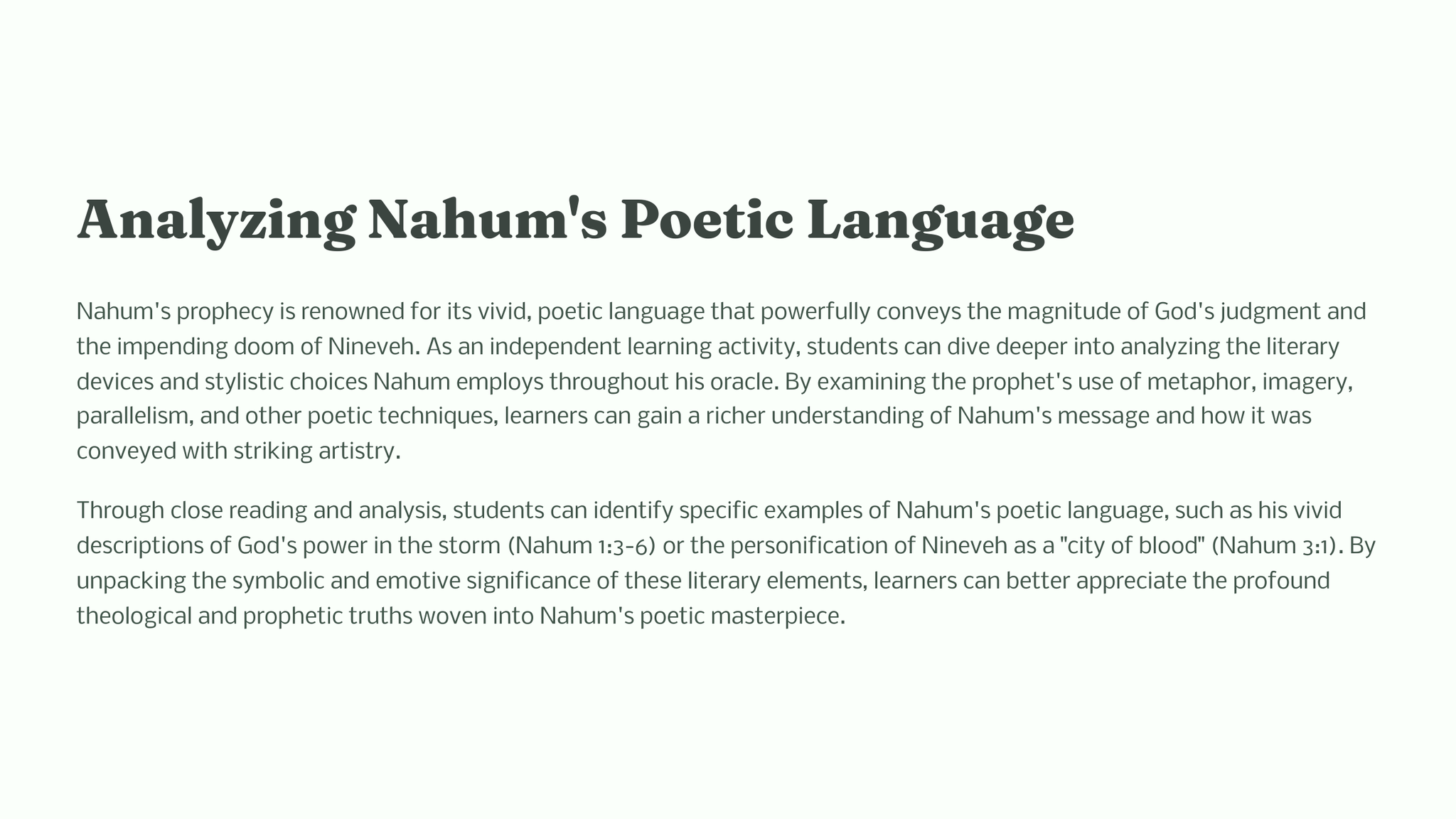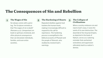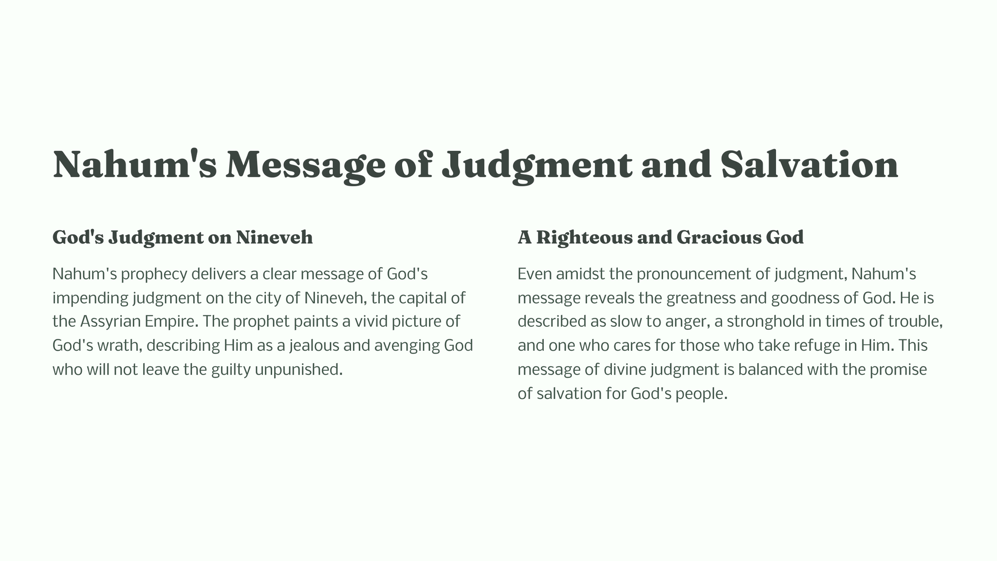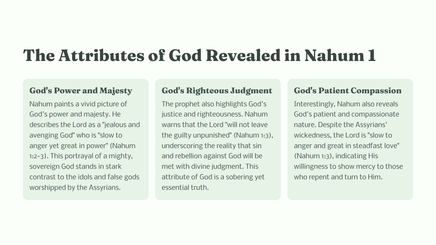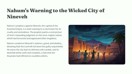 In the book of Nahum, the prophet delivers a powerful message from God regarding the impending judgment on the city of Nineveh. This dramatic proclamation sets the stage for a vivid depiction of God's sovereignty, justice, and mercy.