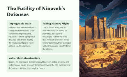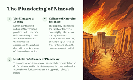 In this chapter, the prophet Nahum vividly describes the coming judgment and destruction of the great city of Nineveh, the capital of the Assyrian Empire. The imagery is powerful, depicting the siege, the chaos, and the ultimate downfall of this once-mighty city.