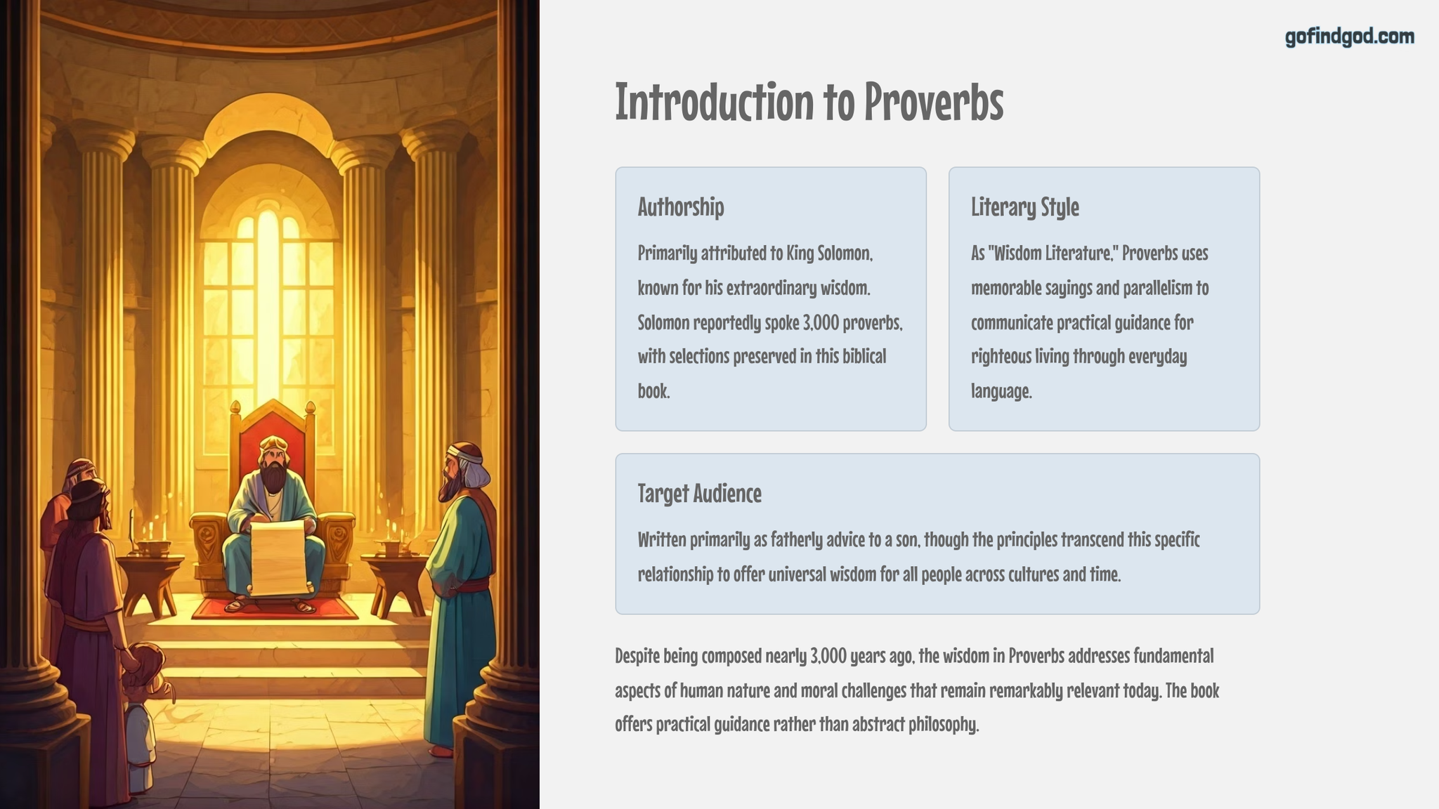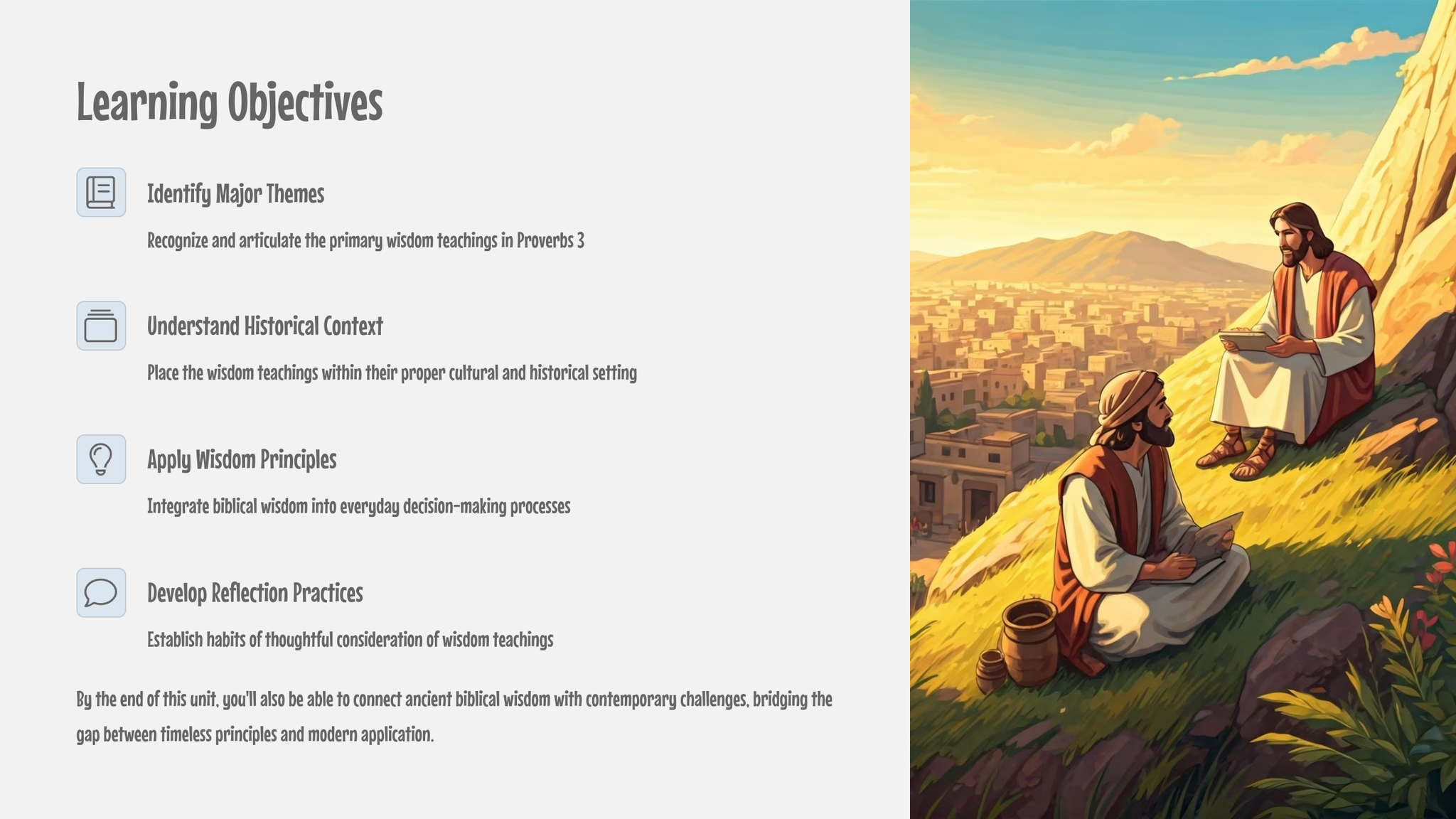 • 🧠 Life Application – Real-world scenarios, creative writing tasks, and case studies for living out wisdom today.