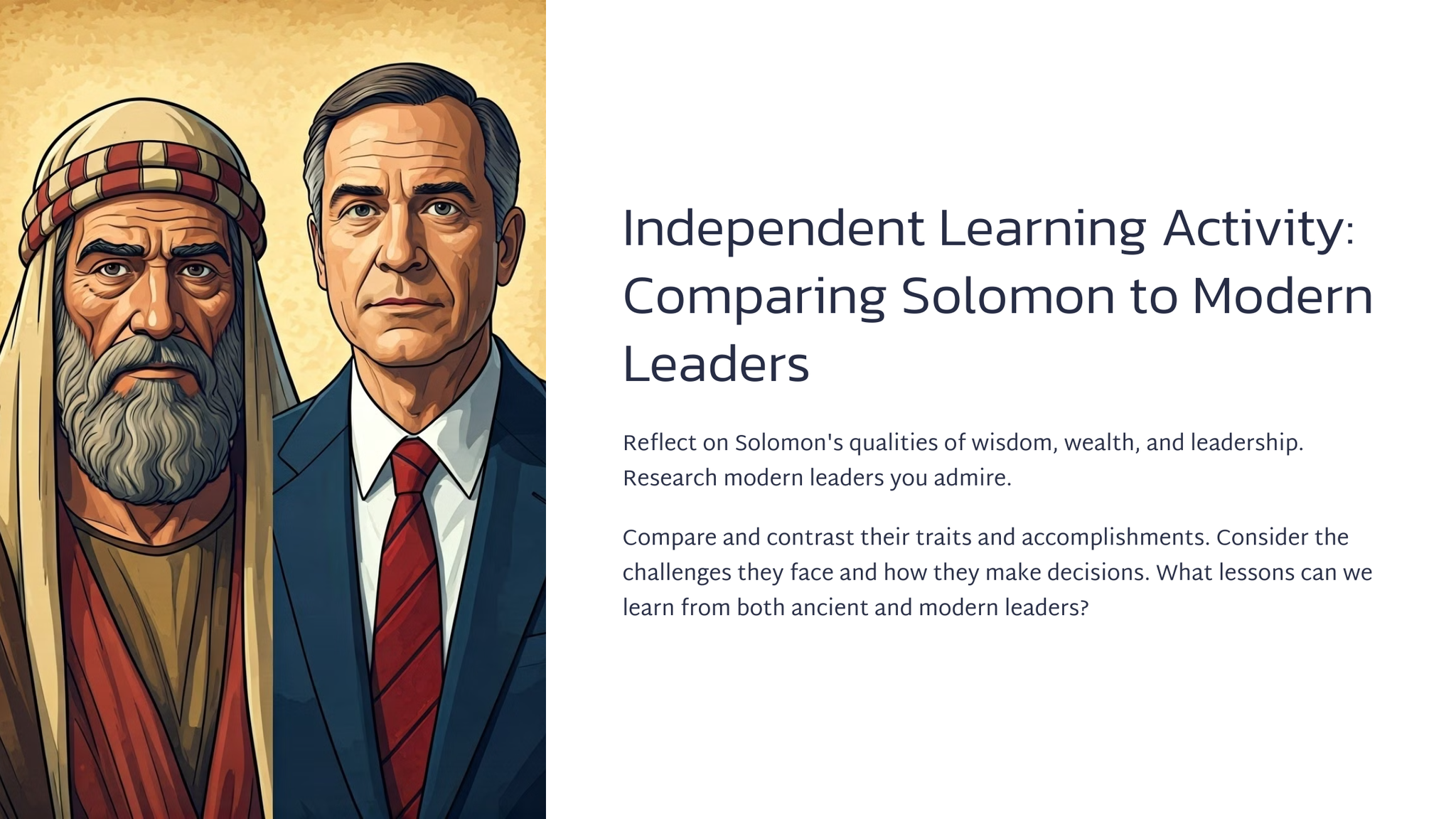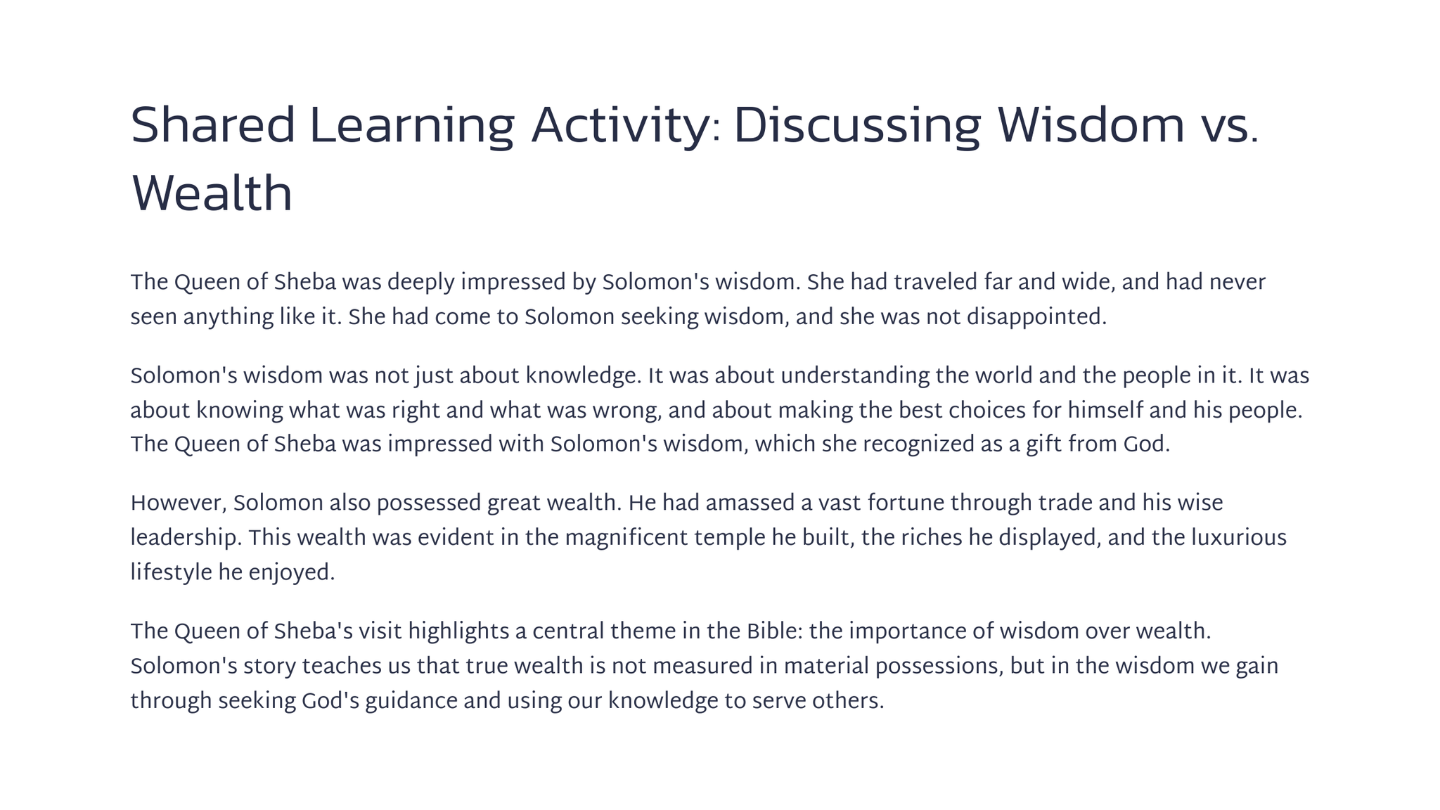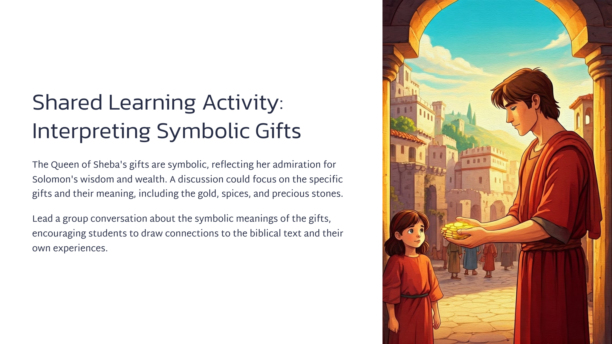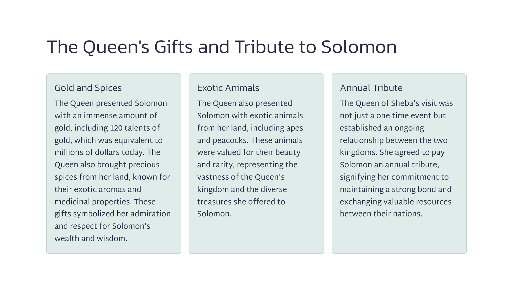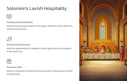 She tests his wisdom with riddles and gifts, and Solomon answers her questions and demonstrates his knowledge.