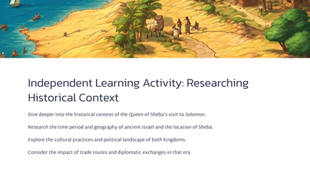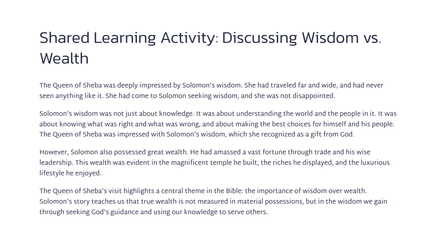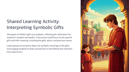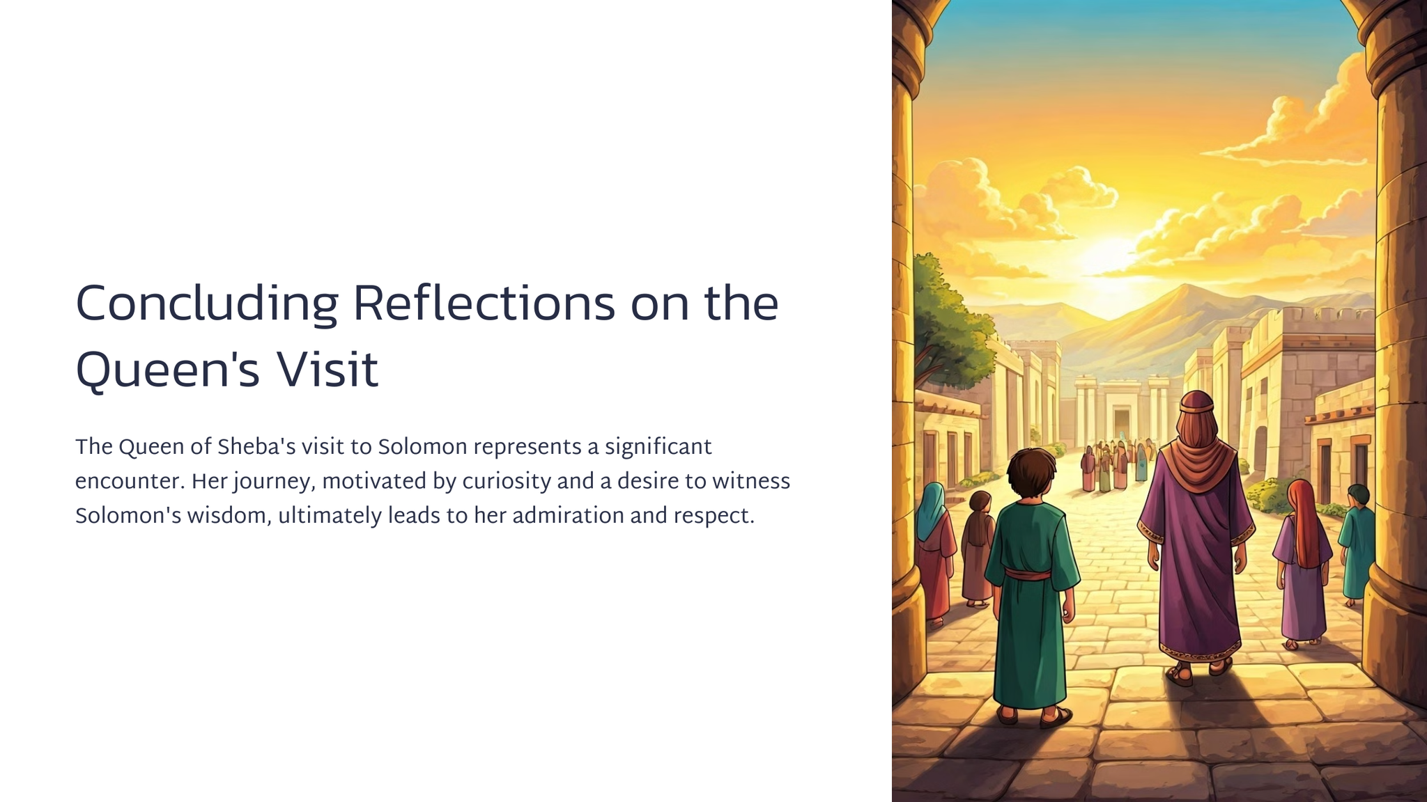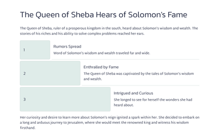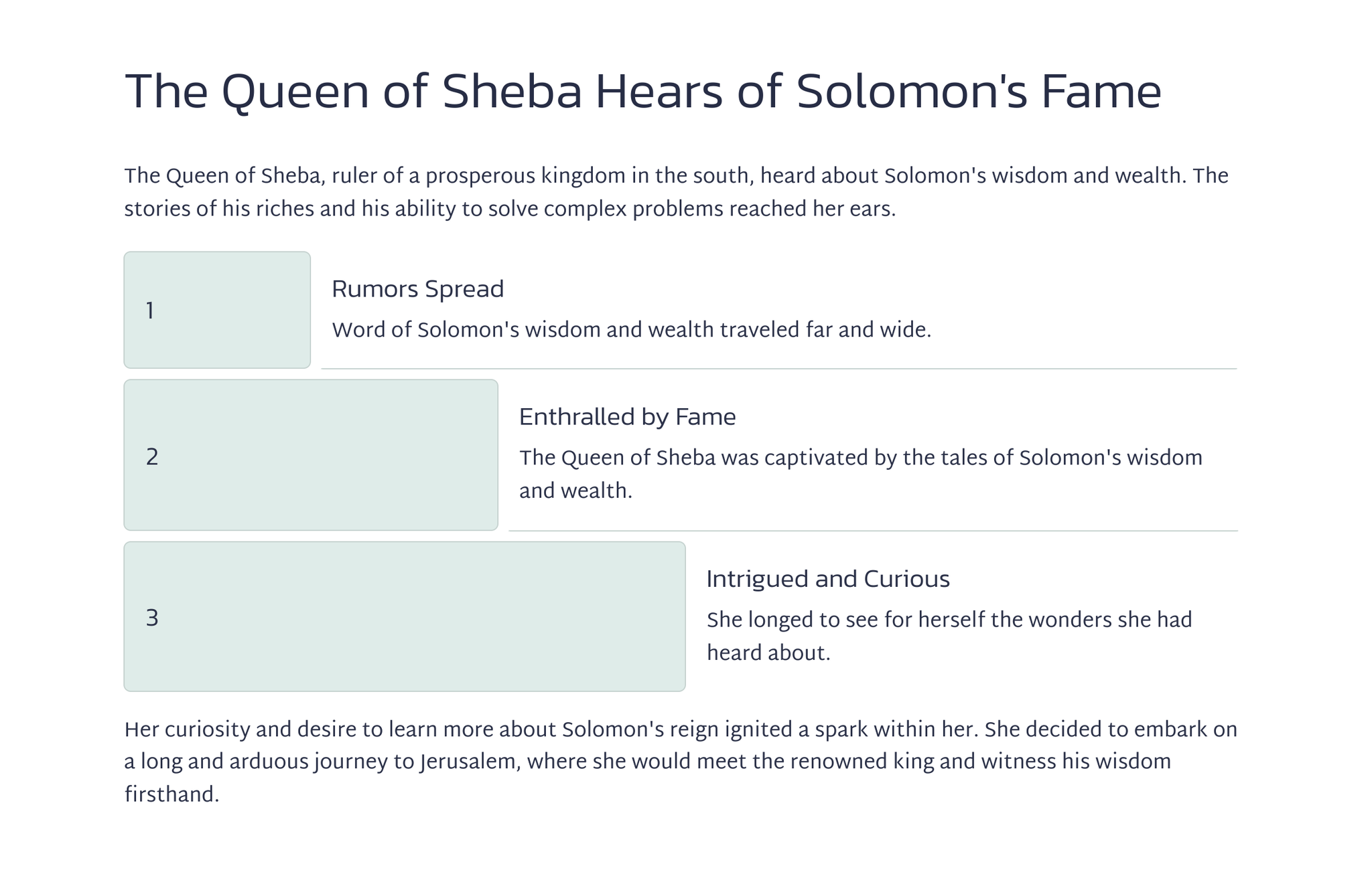 The Queen of Sheba, impressed by Solomon's wisdom and prosperity, travels to Jerusalem to meet him.