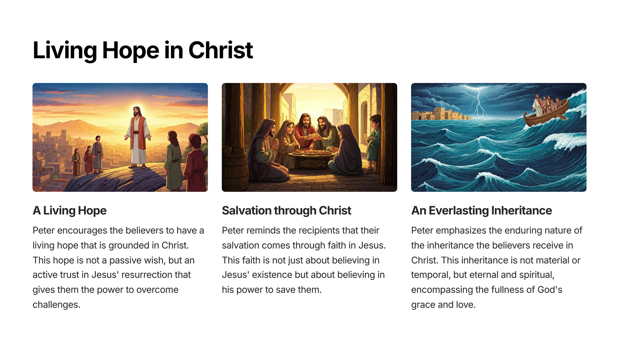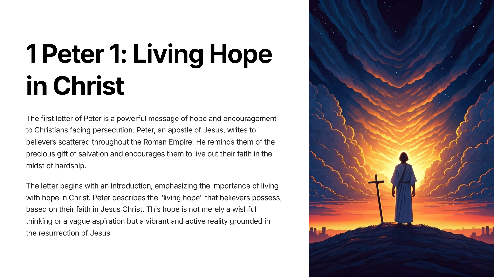 The letter begins with an introduction, emphasizing the importance of living with hope in Christ. Peter describes the "living hope" that believers possess, based on their faith in Jesus Christ. This hope is not merely a wishful thinking or a vague aspiration but a vibrant and active reality grounded in the resurrection of Jesus.